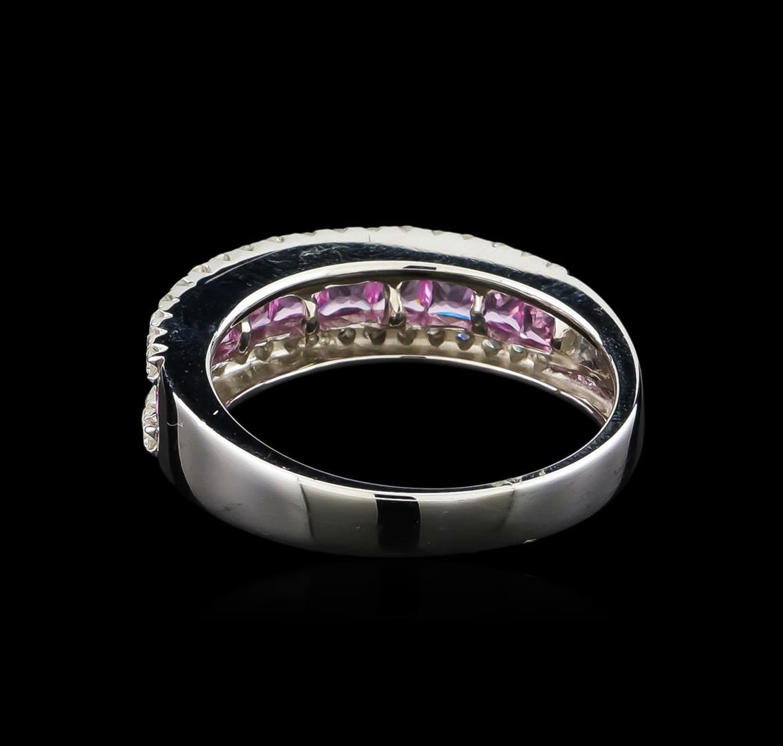 One electronically tested 14KT white gold ladies cast pink sapphire and diamond ring with a bright polish finish. The ring features a five millimeter wide pink sapphire and diamond ribbon supported by tapering shoulders, completed by a three millimeter wide band. Trademark is CJ. Identified with markings of "14K". Condition is new, good workmanship. Containing: Eleven channel set square mixed cut natural pink sapphires, measuring 2.40 x 2.30 x 1.53mm, approximate total weight of 0.88ct., clarity is eye clean, medium, very slightly grayish, pink color, (GIA Pk 5/3), cut is good. Transmitting light with no distortion, transparent. Measurements & the color grade are an average for the group. Graded in the setting. Thirty-Six prong set round brilliant cut diamonds, measuring 1.40 - 1.30 x 0.81mm (depth est.) approximate total weight of 36 Stones = 0.35ct. Graded in the setting. Clarity: I-1 to I-2. Color: G - I. Total Weight of Colored Stones 0.88ct. Total Weight of Diamonds 0.35ct. Total Weight of Ring 3.53gm. AIG Appraised at $1,740.00.