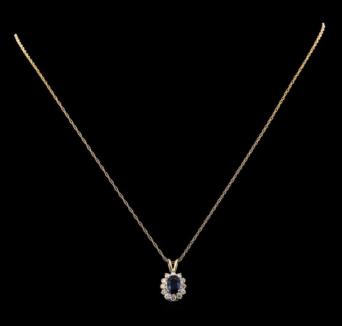 One pendant with chain featuring: 14KT yellow gold weighing 2.5 grams containing one sapphire weighing 0.88ct and diamonds weighing 0.38ctw.