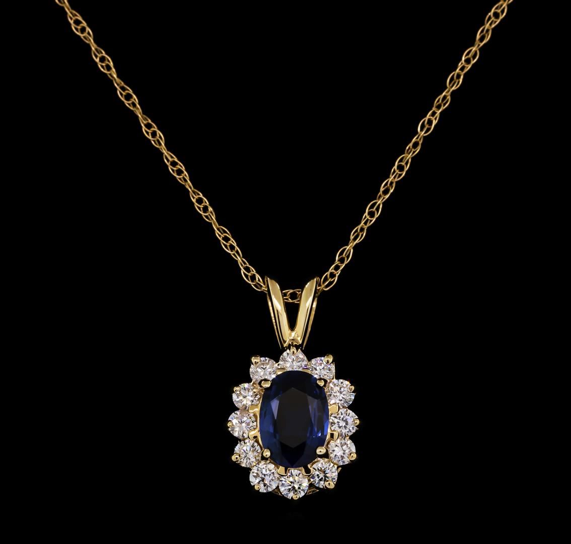 One pendant with chain featuring: 14KT yellow gold weighing 2.5 grams containing one sapphire weighing 0.88ct and diamonds weighing 0.38ctw.