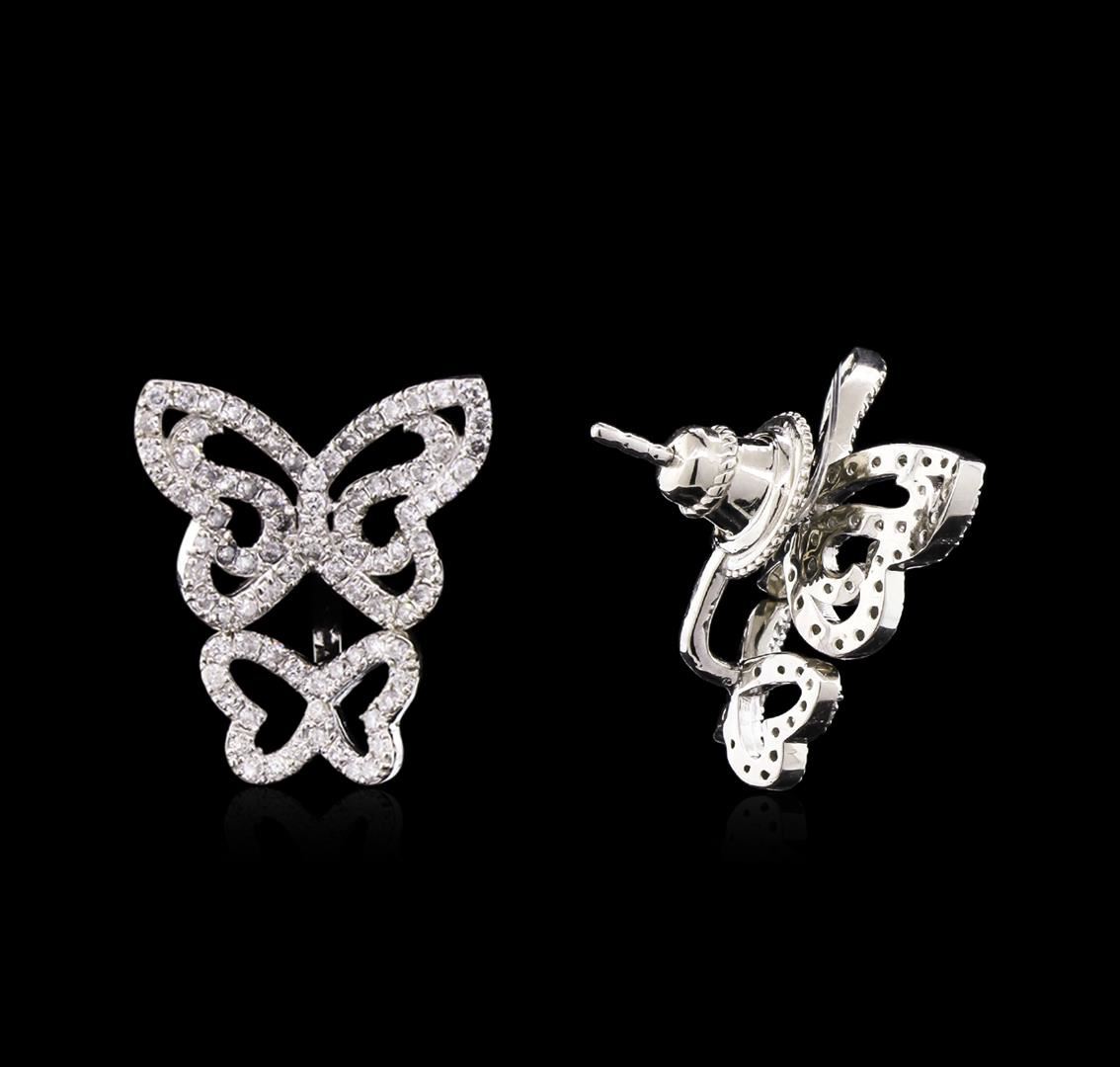One pair electronically tested 14KT white gold lady's cast butterfly shape earrings with earring jackets with friction posts with a bright polish finish. Identified with markings of "K14". Condition is new, good workmanship. Containing: One Hundred Seventy-Eight prong set round brilliant cut diamonds, measuring 1.10 - 1.05 x 0.70mm (depth est.) approximate total weight of 178 Stones = 0.88ct. Graded in the setting. Clarity: SI-1 to I-1 . Color: G - I. Cut Good. Total Weight of Diamonds 0.88ct.. Total Weight of Earrings With Earring Jackets 6.30gm at $ 4270.00 GAS Appraised.