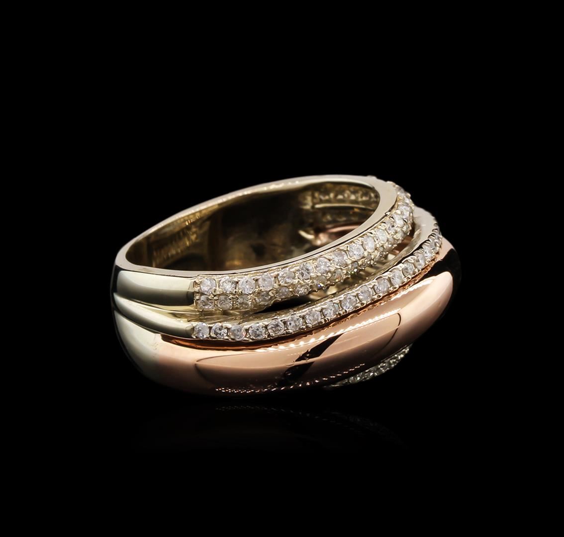 One electronically tested 14KT rose and white gold lady's combination cast & assembled fashion ring with a bright polish finish. The featured lady's ring has a wide band multi-row crossover motif and a shank measuring 5.30 millimeters wide. Identified with markings of "K14". Condition is new, good workmanship. Containing: One Hundred Forty-Five prong set round brilliant cut diamonds, measuring 1.20 - 1.10 x 0.75mm (depth est.) approximate total weight of 145 Stones = 0.88ct. Graded in the setting. Clarity: SI-2 to I-2. Color: H - Good. Total Weight of Diamonds 0.88ct. Total Weight of Ring 7.30gm. GAS Appraised at $4,370.00.