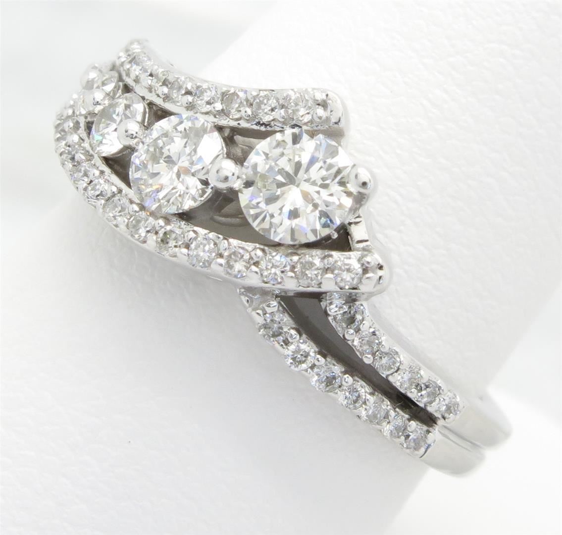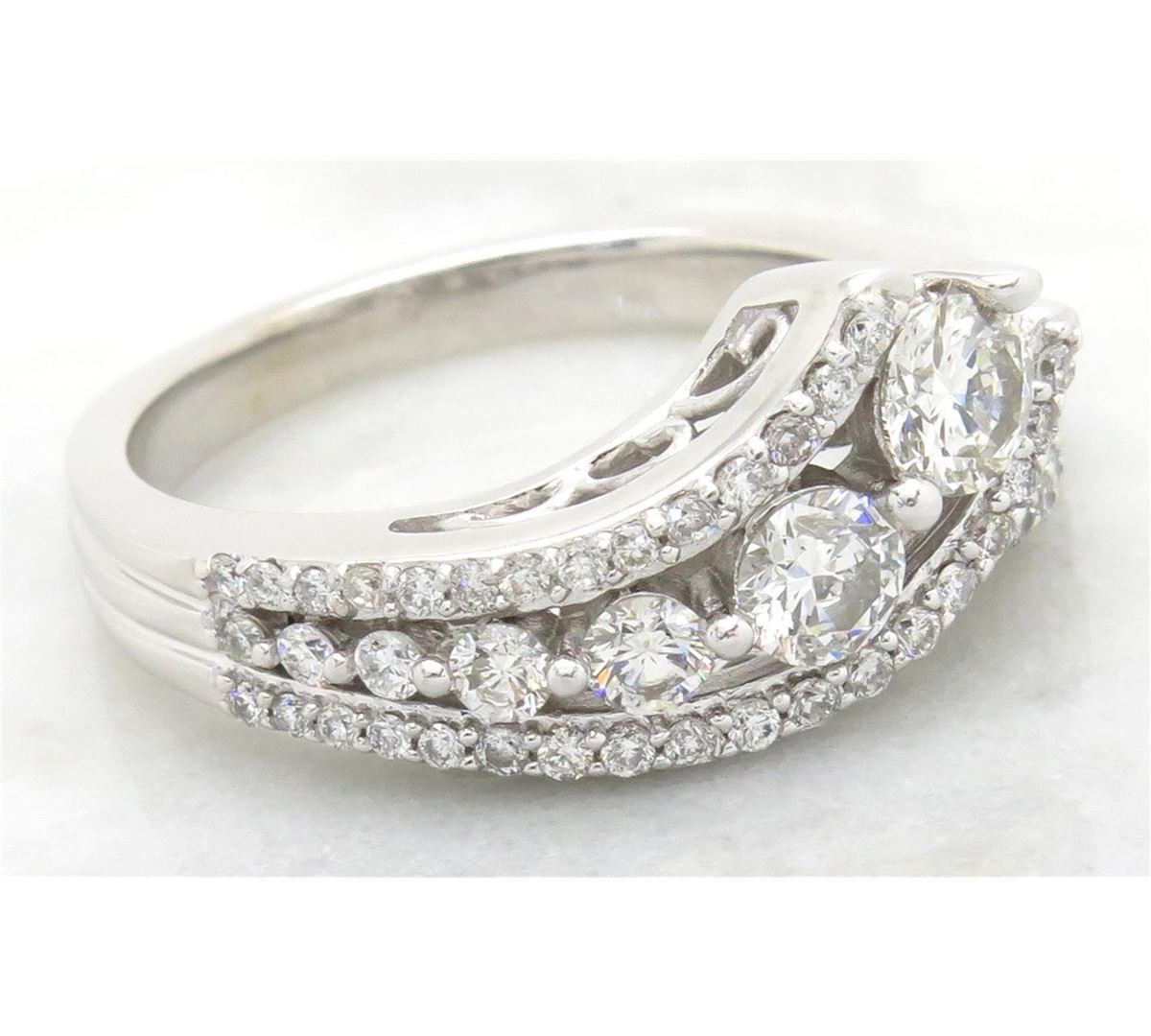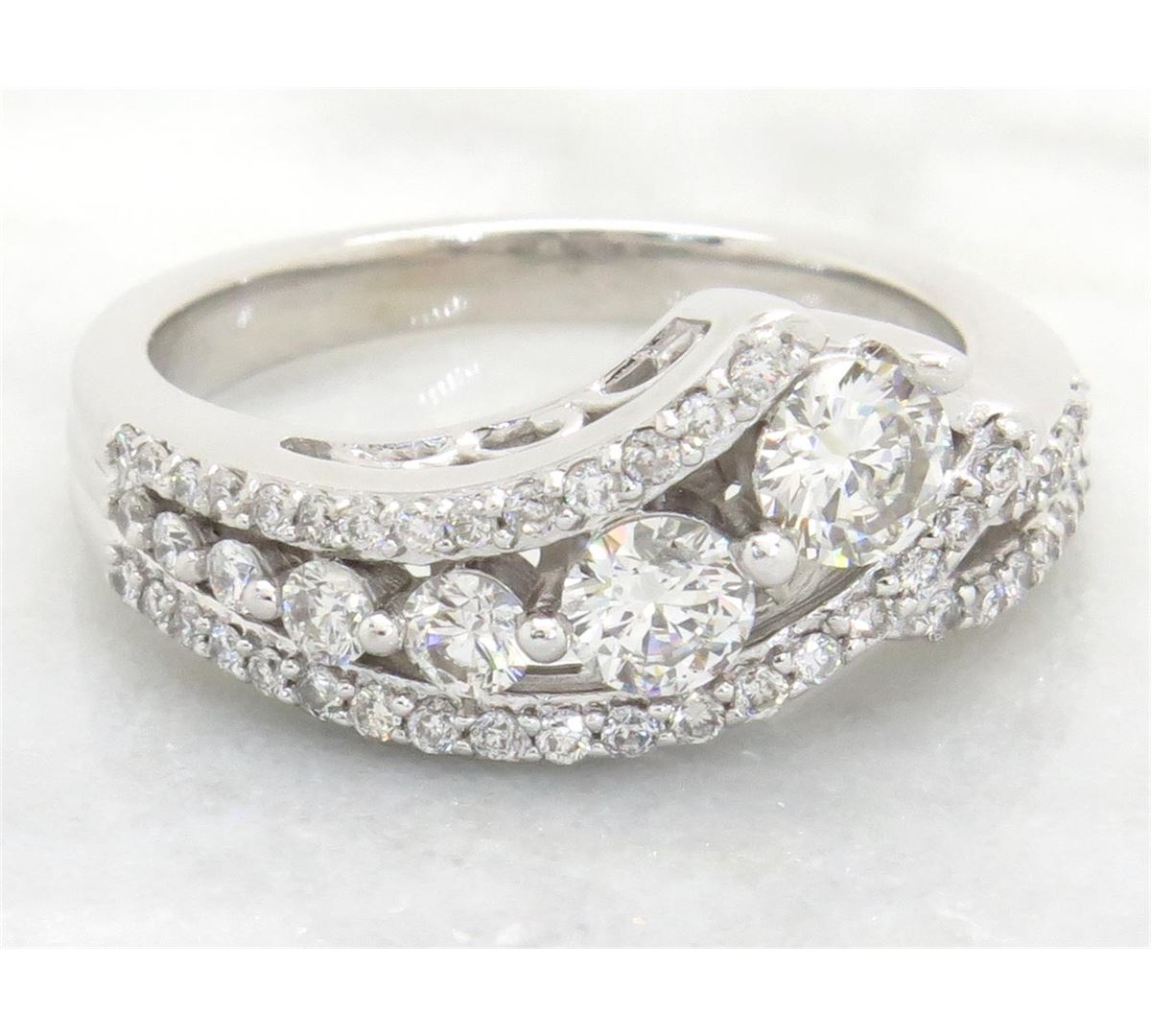 One tested 14K white gold diamond ring. Containing: 52 Round Brilliant Cut Diamonds. Clarity: I-SI, Color: G-H. Approximate total diamond weight: .89CTW. Diamonds are graded in the mounting, unless otherwise stated. Weight of ring: 6.0 grams. Size: 7.0.
