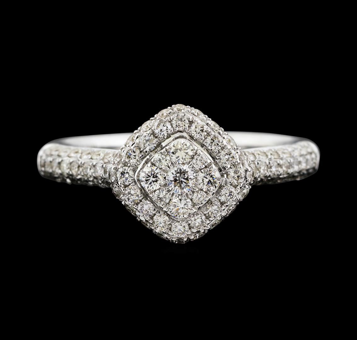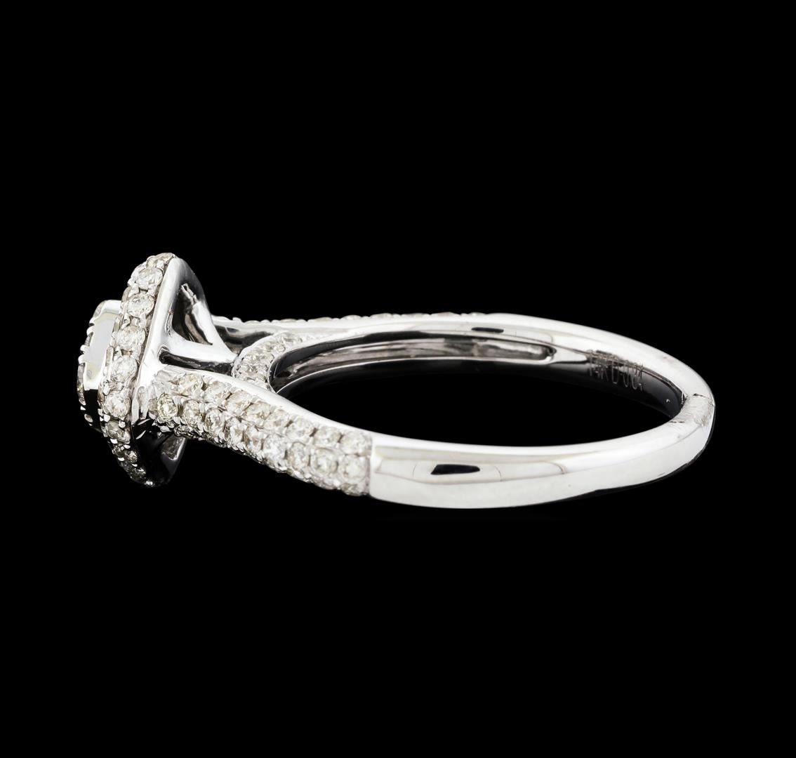 One electronically tested 14KT white gold lady's cast wedding ring with a double halo with a bright polish finish. The featured lady's ring has a shank measuring 2.19 millimeters wide. Identified with markings of '14K'. Condition is new, good workmanship. Containing: One prong set round brilliant cut diamond, measuring 2.30 - 2.25 x 1.41mm (depth est.) approximate weight of 0.04ct. Graded in the setting. Clarity SI-2. Color: H Cut Good Four prong set round brilliant cut diamonds, measuring 2.20 - 2.10 x 1.33mm (depth est.) approximate total weight of 4 Stones = 0.15ct. Graded in the setting. Clarity VS-2 to SI-1. Color: H - I Cut Good One Hundred prong set round brilliant cut diamonds, measuring 1.25 - 1.15 x 0.73mm (depth est.) approximate total weight of 100 Stones = 0.64ct. Graded in the setting. Clarity VS-2 to SI-2. Color: H - I Cut Good. Total Weight of Diamonds 0.83ct.. Total Weight of Ring 3.70gm. GAS Appraised at $3,430.00.