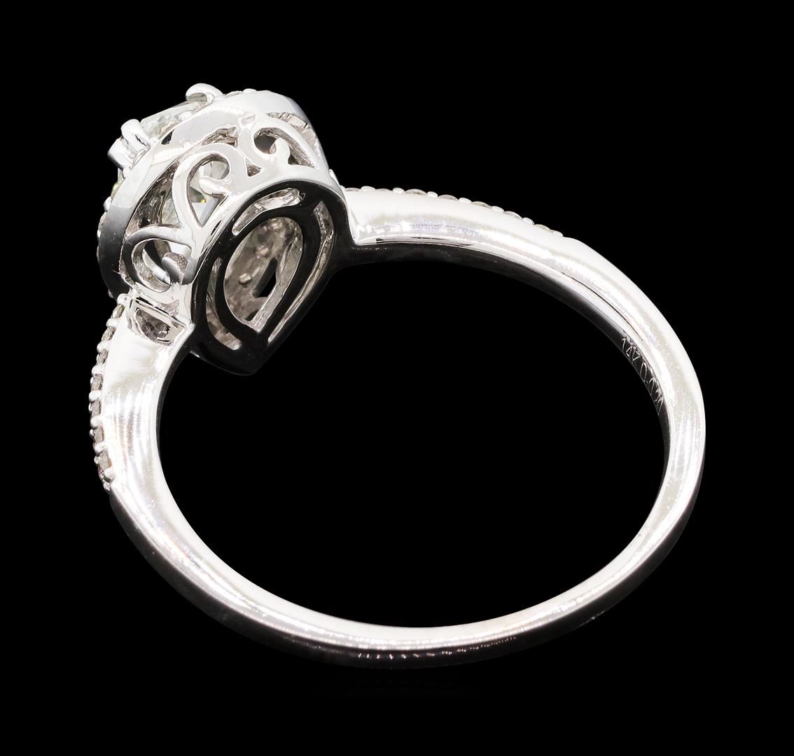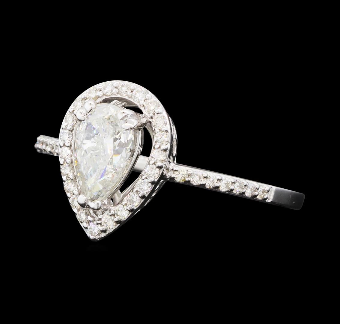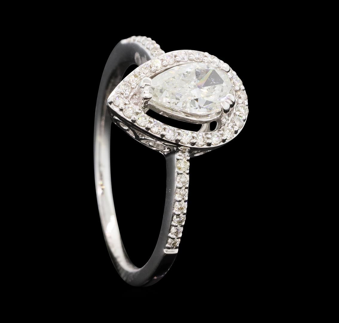 One electronically tested 14KT white gold lady's cast wedding ring with a cathedral shank with a basket halo with a bright polish finish. The featured lady's ring has a shank measuring 1.30 millimeters wide. Identified with markings of '14K'. Condition is new, good workmanship. Containing: One prong set pear shaped cut diamond, measuring 7.60 x 4.54 x 2.93mm (depth est.) , 5.00.%. GTCF approximate weight of 0.69ct. Graded in the setting. Color I Clarity I-1 Cut Very Good Thirty-Six prong set round brilliant cut diamonds, measuring 1.20 - 1.05 x 0.70mm (depth est.) approximate total weight of 36 Stones = 0.20ct. Graded in the setting. Color G - H Clarity VS-2 to SI-1 Cut Very Good. Total Weight of Diamonds 0.89ct.. Total Weight of Ring 2.50gm GAS Appraised at $3,990.00.