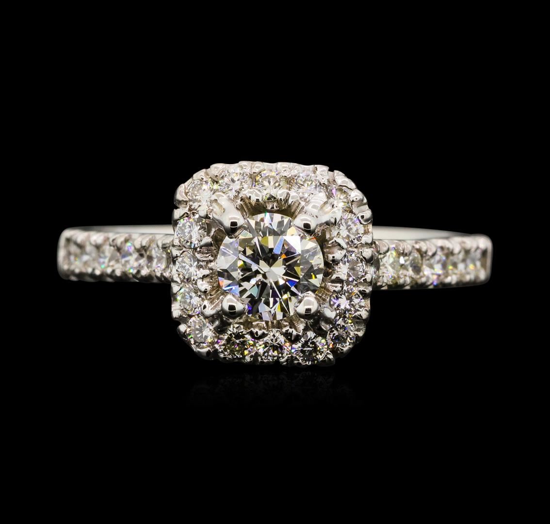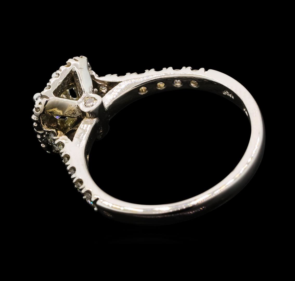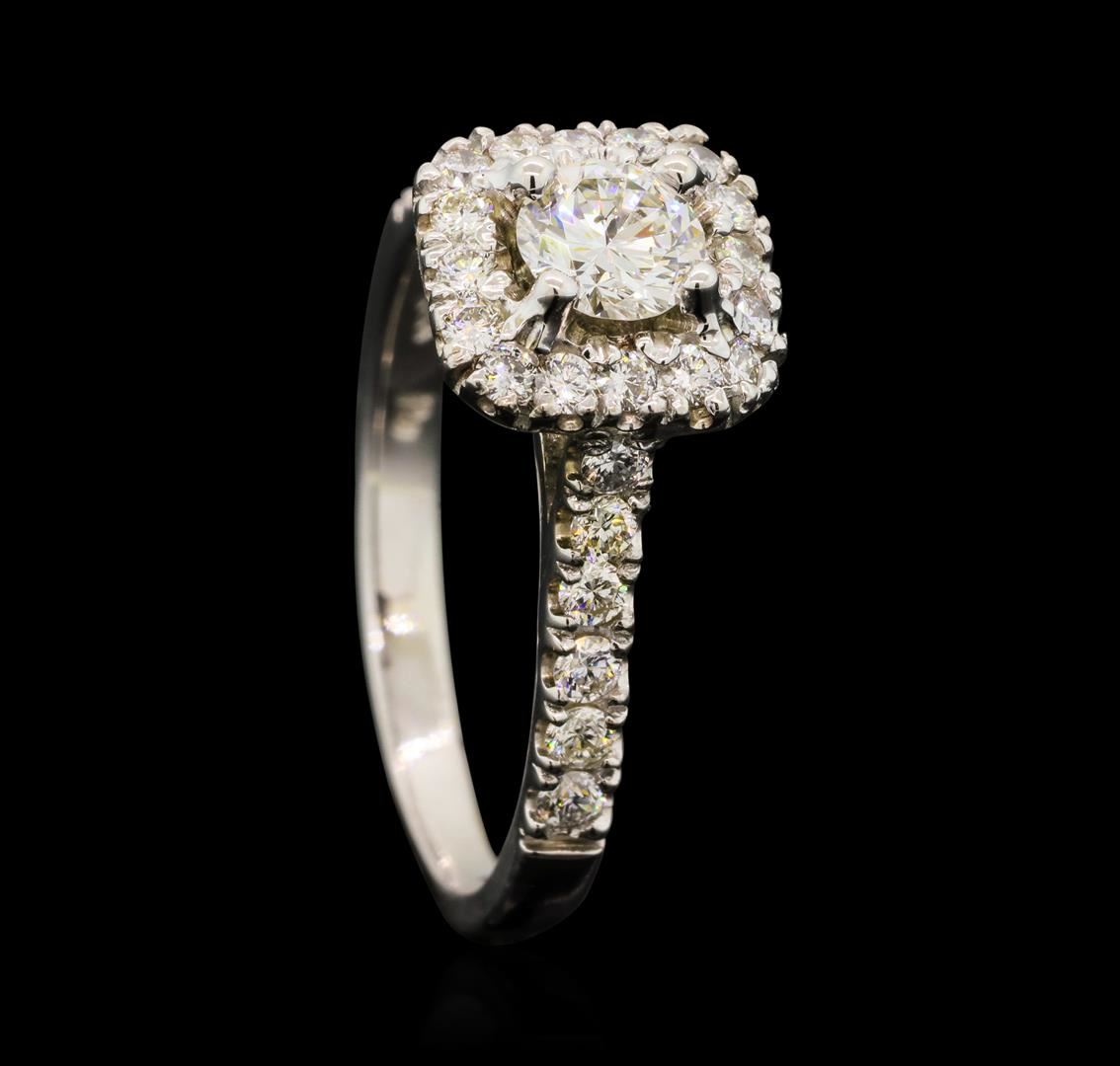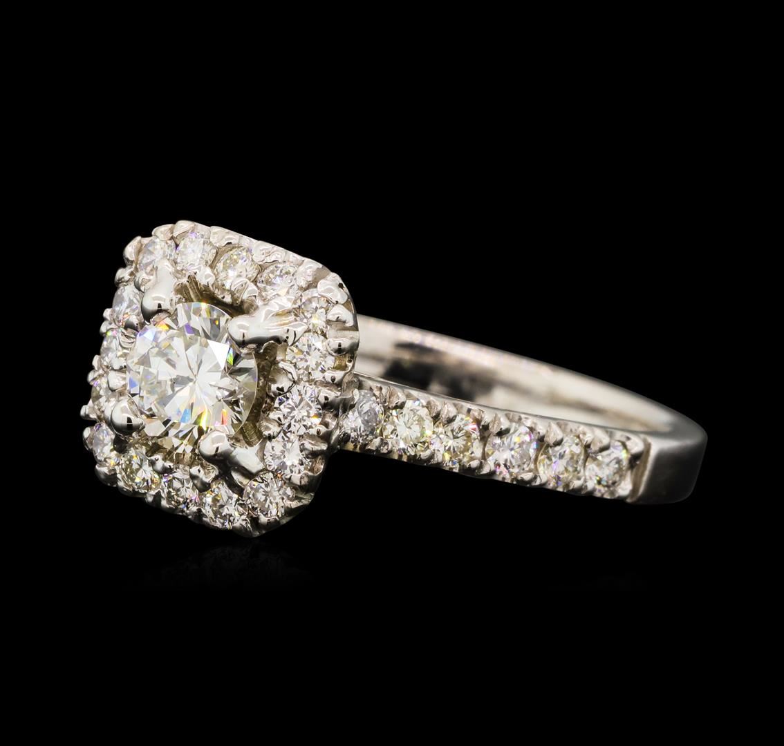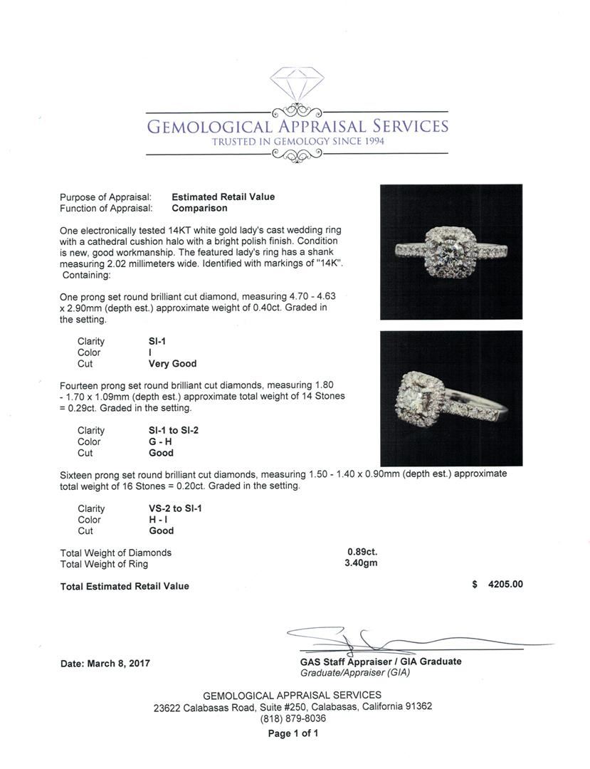 One electronically tested 14KT white gold lady's cast wedding ring with a cathedral cushion halo with a bright polish finish. The featured lady's ring has a shank measuring 2.02 millimeters wide. Identified with markings of '14K'. Condition is new, good w GAS Appraised at $4,205.00.