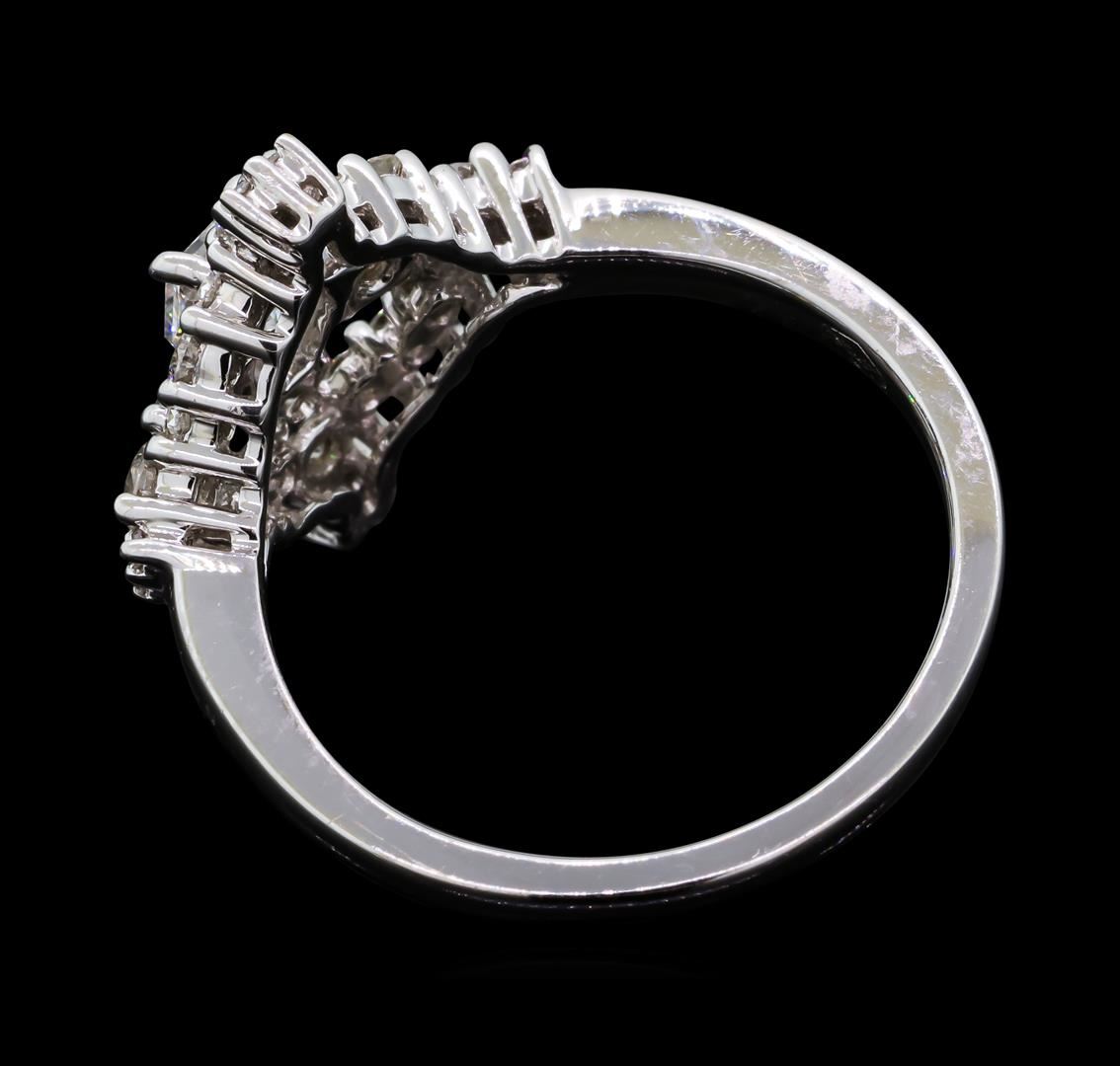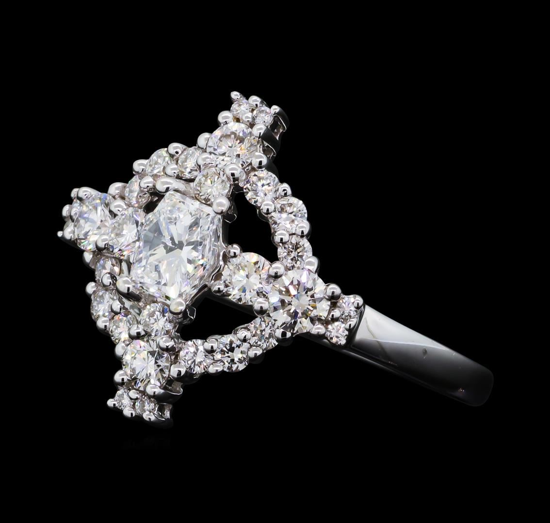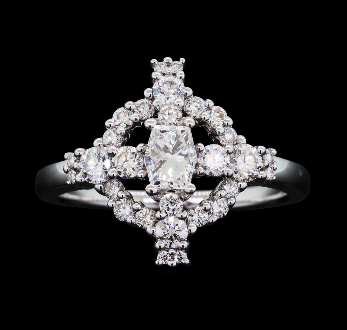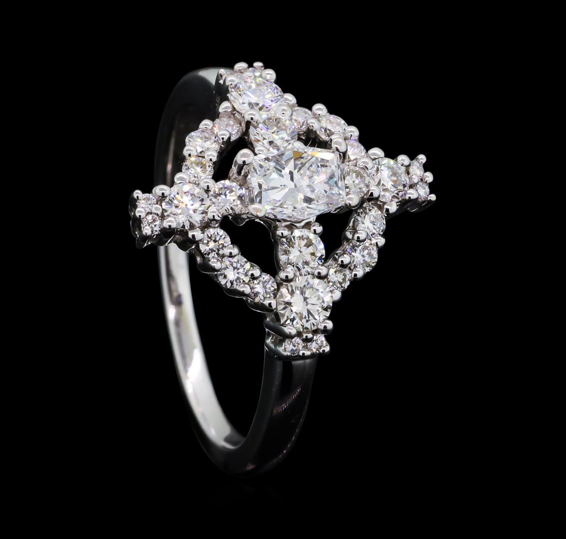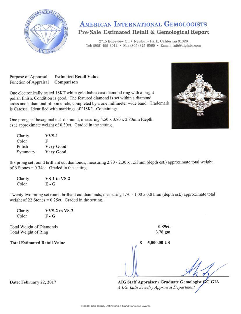 One electronically tested 18KT white gold ladies cast diamond ring with a bright polish finish. The featured diamond is set within a diamond cross and a diamond ribbon circle, completed by a one millimeter wide band. Trademark is Caressa. Identified with markings of '18K'. Condition is good. Containing: One prong set hexagonal cut diamond, measuring 4.50 x 3.80 x 2.80mm (depth est.) approximate weight of 0.30ct. Graded in the setting. Clarity VVS-1. Color: F Six prong set round brilliant cut diamonds, measuring 2.80 - 2.30 x 1.53mm (depth est.) approximate total weight of 6 Stones = 0.34ct. Graded in the setting. Clarity VS-1 to VS-2. Color: E - G Twenty-Two prong set round brilliant cut diamonds, measuring 1.70 - 1.00 x 0.81mm (depth est.) approximate total weight of 22 Stones = 0.25ct. Graded in the setting. Clarity VVS-2 to VS-2. Color: F - G. Total Weight of Diamonds 0.89ct.. Total Weight of Ring 3.78gm. AIG Appraised at $5,000.00.