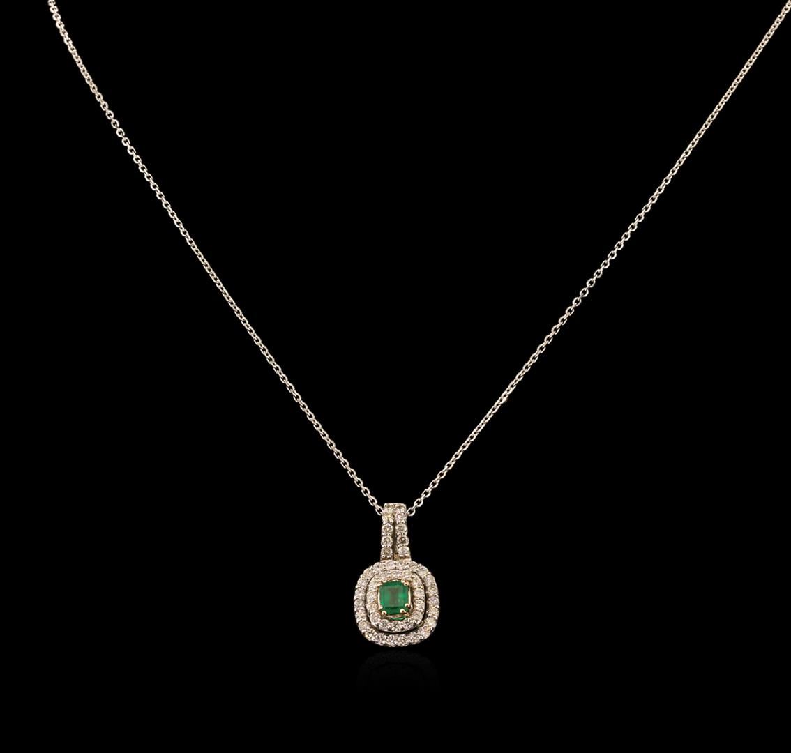 One electronically tested 14KT white gold ladies cast & assembled emerald and diamond pendant with chain. The pendant features an emerald set within tiered diamond bezels, completed by a diamond set bail. The pendant was supported by an eighteen inch length 14KT white gold link chain, terminating in a lobster claw clasp. Bright polish finish with yellow gold accents. Identified with markings of "K14". Condition is new, good workmanship. Containing: One prong set rectangular step cut natural emerald exact weight 0.89ct., clarity is heavily included, type III, medium dark, moderately strong, very slightly bluish green color, (GIA vslbG 6/4), cut is good. Transmitting light somewhat diffusely, transparent to translucent. Naturally occurring internal & external characteristics are present. Indications of oil residue. Graded in the setting. Forty-Six prong set round brilliant cut diamonds exact total weight 46 Stones = 1.20ct. Graded in the setting. Clarity: SI-2 to I-1. Color: G - I. Total Weight of Colored Stones 0.89ct. Total Weight of Diamonds 1.20ct. Total Weight of Pendant With Chain 6.91gm. AIG Appraised at $5,080.00.