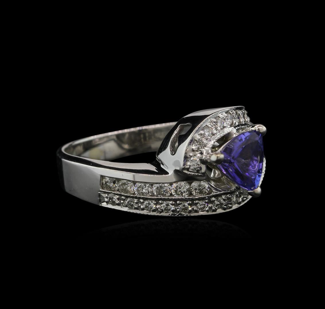 One ring featuring: 14KT white gold weighing 8.23 grams containing one prong set pyramid shape tanzanite center stone with a total weight of 0.89ct and pave and channel set round diamonds with a total weight of 0.67ct.