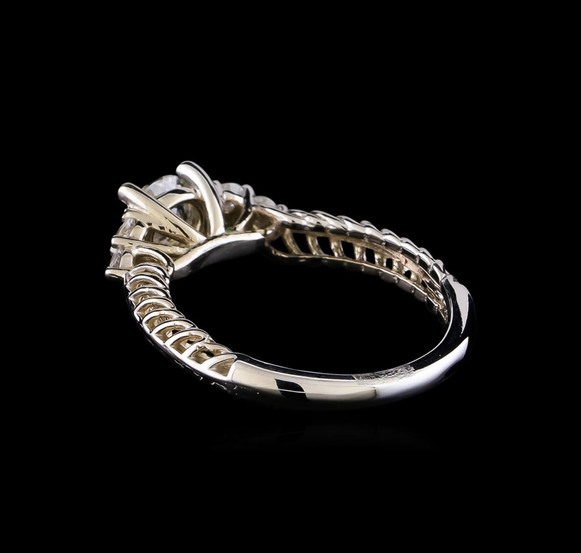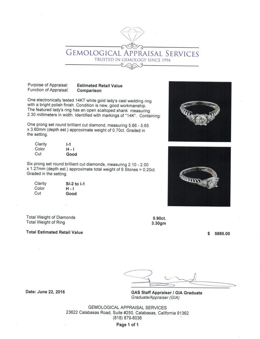One electronically tested 14KT white gold lady's cast wedding ring with a bright polish finish. The featured lady's ring has an open scalloped shank measuring 2.30 millimeters in width. Identified with markings of "14K". Condition is new, good workmanship. Containing: One prong set round brilliant cut diamond, measuring 5.66 - 5.65 x 3.60mm (depth est.) approximate weight of 0.70ct. Graded in the setting. Clarity: I-1. Color: H - I. Cut Good Six prong set round brilliant cut diamonds, measuring 2.10 - 2.00 x 1.27mm (depth est.) approximate total weight of 6 Stones = 0.20ct. Graded in the setting. Clarity: SI-2 to I-1. Color: H - I. Cut Good. Total Weight of Diamonds 0.90ct. Total Weight of Ring 3.30gm. GAS Appraised at $5,885.00.