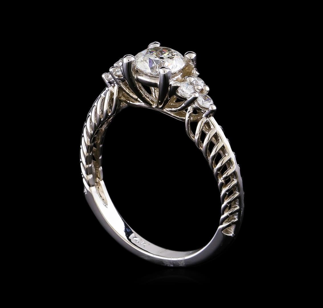 One electronically tested 14KT white gold lady's cast wedding ring with a bright polish finish. The featured lady's ring has an open scalloped shank measuring 2.30 millimeters in width. Identified with markings of "14K". Condition is new, good workmanship. Containing: One prong set round brilliant cut diamond, measuring 5.66 - 5.65 x 3.60mm (depth est.) approximate weight of 0.70 ct. Graded in the setting. Clarity: I-1. Color: H - I. Cut Good Six prong set round brilliant cut diamonds, measuring 2.10 - 2.00 x 1.27mm (depth est.) approximate total weight of 6 Stones = 0.20 ct. Graded in the setting. Clarity: SI-2 to I-1. Color: H - I. Cut Good. Total Weight of Diamonds 0.90 ct. Total Weight of Ring 3.30gm. GAS Appraised.