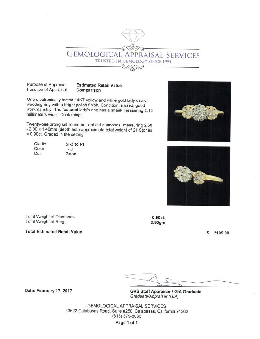 One electronically tested 14KT yellow and white gold lady's cast wedding ring with a bright polish finish. The featured lady's ring has a shank measuring 2.18 millimeters wide. Condition is used, good workmanship. Containing: Twenty-One prong set round brilliant cut diamonds, measuring 2.50 - 2.00 x 1.40mm (depth est.) approximate total weight of 21 Stones = 0.90ct. Graded in the setting. Clarity SI-2 to I-1. Color: I - J Cut Good. Total Weight of Diamonds 0.90ct.. Total Weight of Ring 3.90gm. GAS Appraised at $2,195.00.