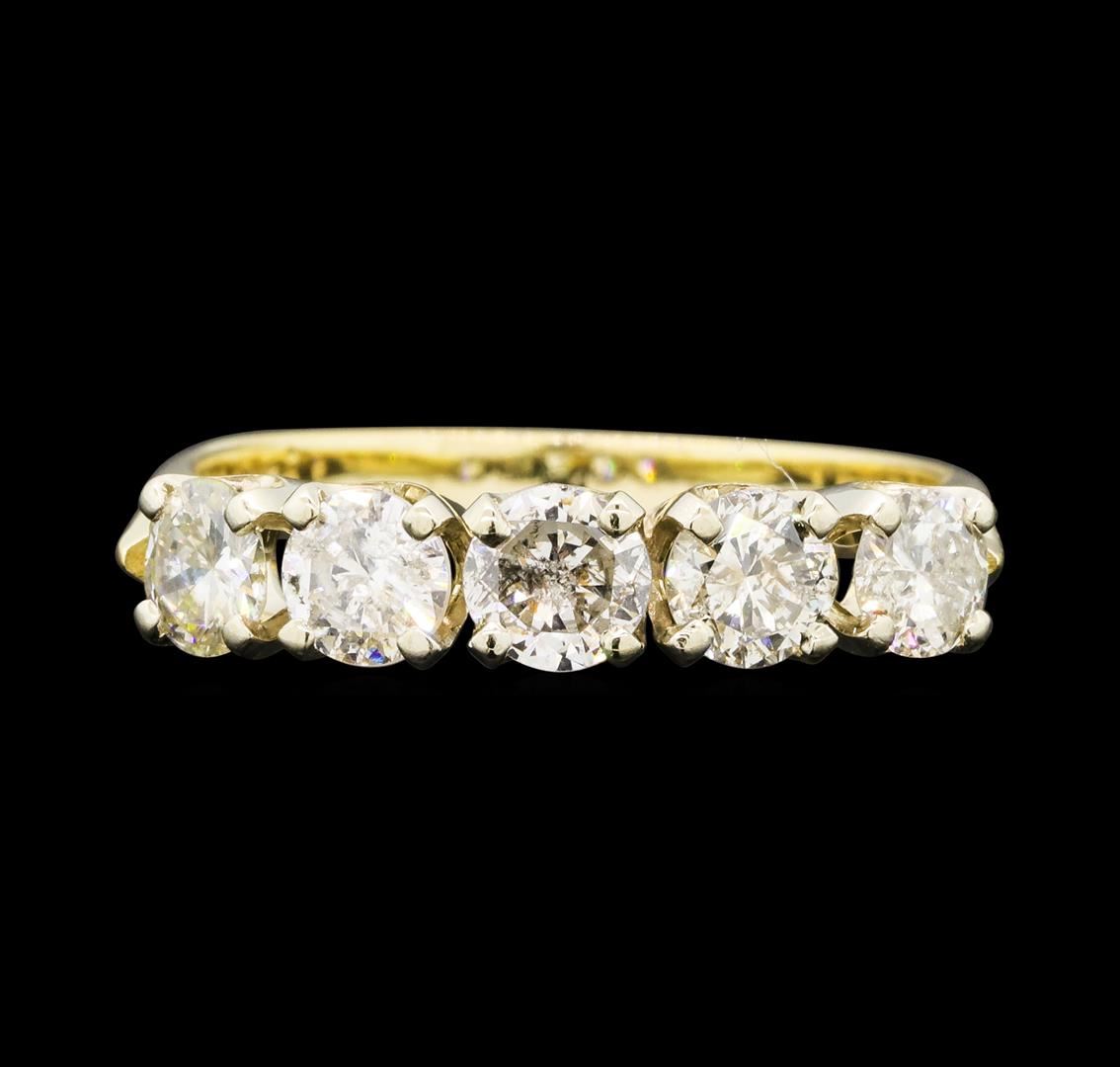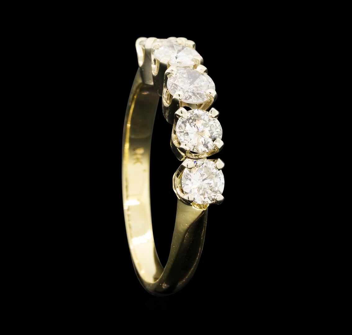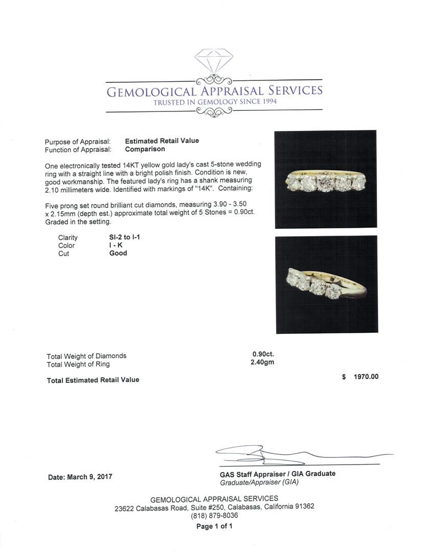 One electronically tested 14KT yellow gold lady's cast 5-stone wedding ring with a straight line with a bright polish finish. The featured lady's ring has a shank measuring 2.10 millimeters wide. Identified with markings of '14K'. Condition is new, good workmanship. Containing: Five prong set round brilliant cut diamonds, measuring 3.90 - 3.50 x 2.15mm (depth est.) approximate total weight of 5 Stones = 0.90ct. Graded in the setting. Color I - K Clarity SI-2 to I-1 Cut Good. Total Weight of Diamonds 0.90ct.. Total Weight of Ring 2.40gm GAS Appraised at $1,970.00.