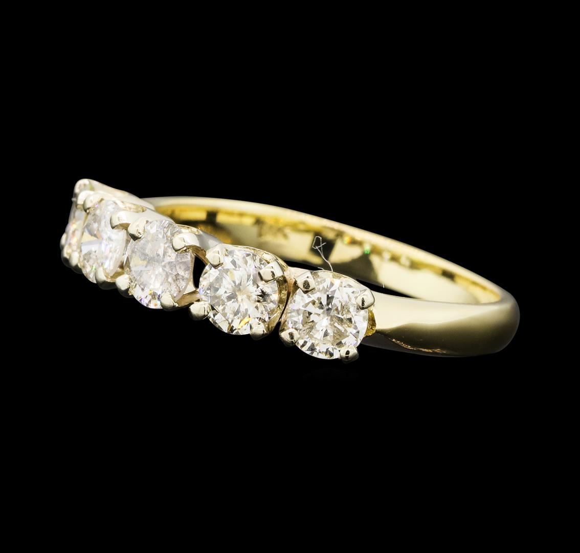 One electronically tested 14KT yellow gold lady's cast 5-stone wedding ring with a straight line with a bright polish finish. The featured lady's ring has a shank measuring 2.10 millimeters wide. Identified with markings of '14K'. Condition is new, good workmanship. Containing: Five prong set round brilliant cut diamonds, measuring 3.90 - 3.50 x 2.15mm (depth est.) approximate total weight of 5 Stones = 0.90ct. Graded in the setting. Color I - K Clarity SI-2 to I-1 Cut Good. Total Weight of Diamonds 0.90ct.. Total Weight of Ring 2.40gm GAS Appraised at $1,970.00.