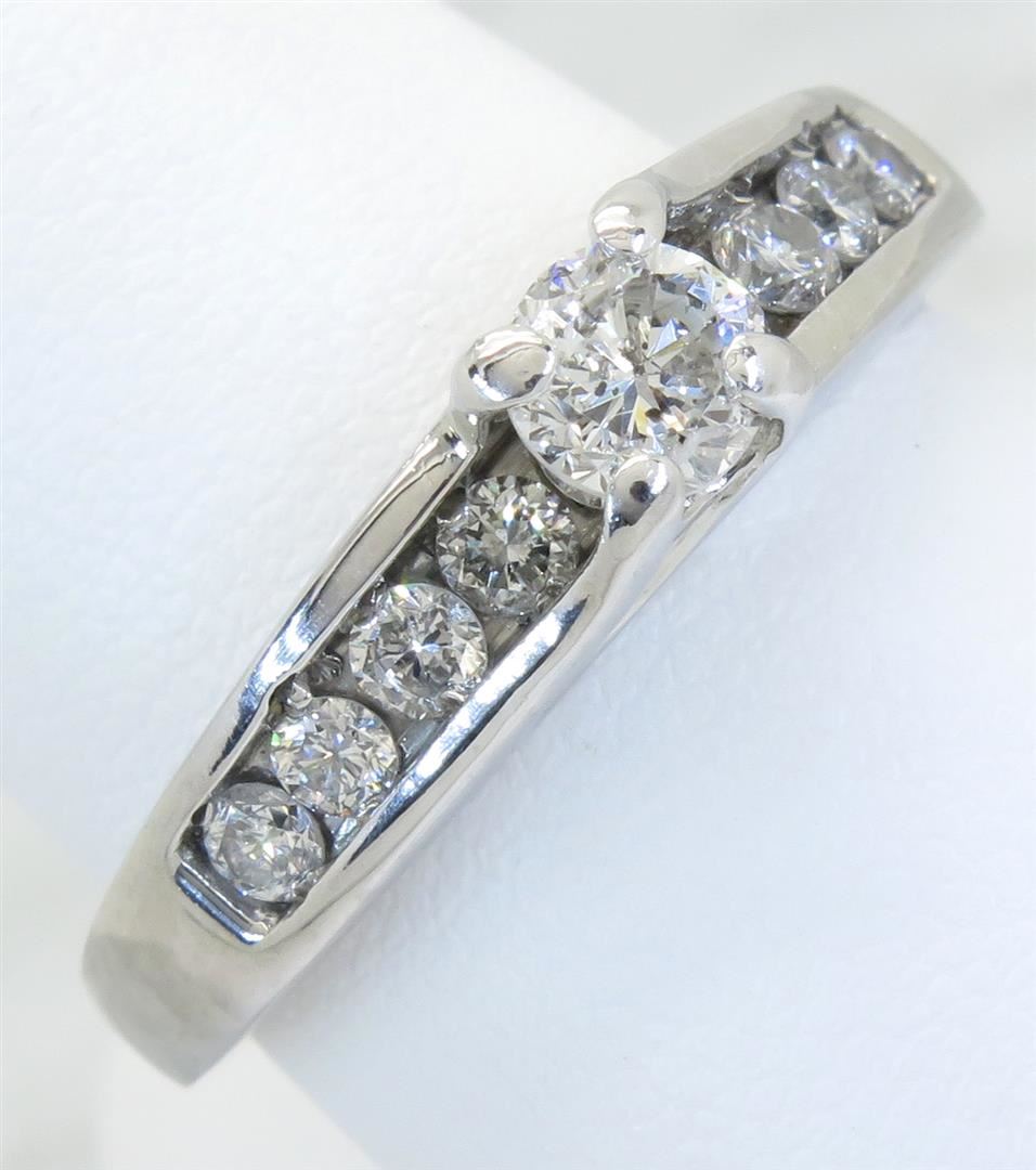 One tested platinum diamond ring. Containing: One Round Brilliant Cut Diamond. Approximate Size: .40CT, Clarity: I1, Color: G-H. 9 Round Brilliant Cut Diamonds. Approximate total diamond weight: .90CTW. All diamonds are graded in the mounting unless otherwise stated. Weight of ring: 8.2 grams, Size: 8.5.