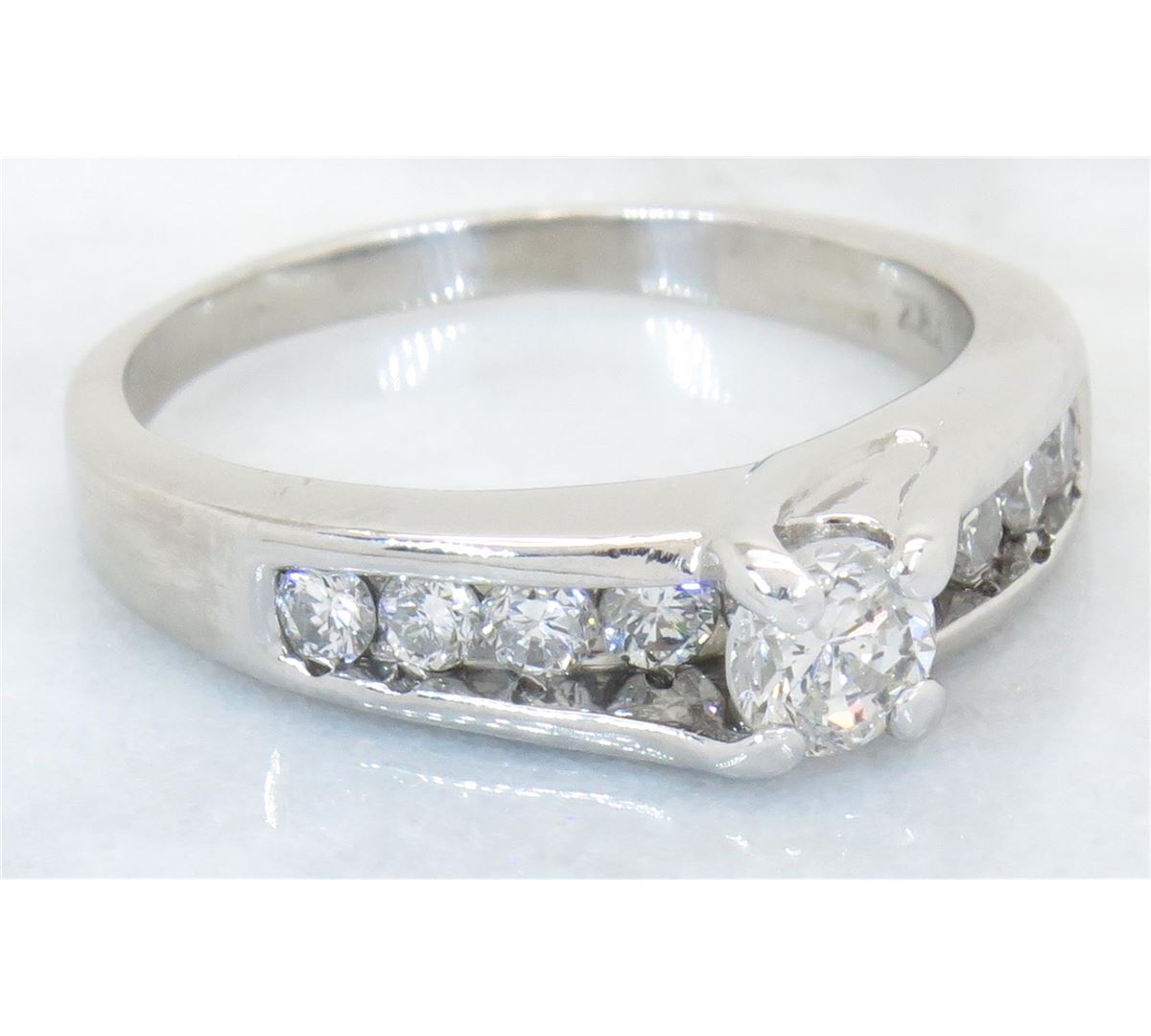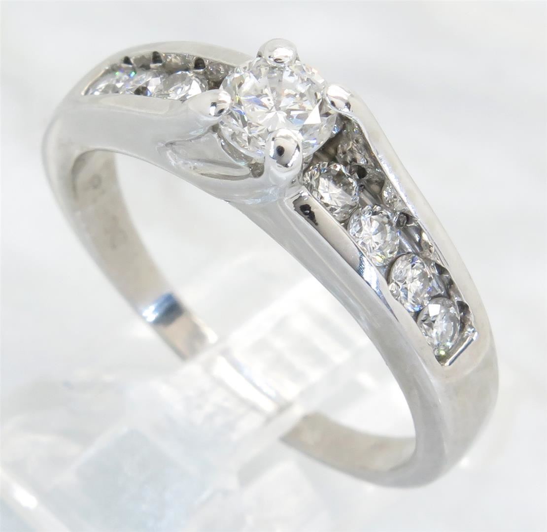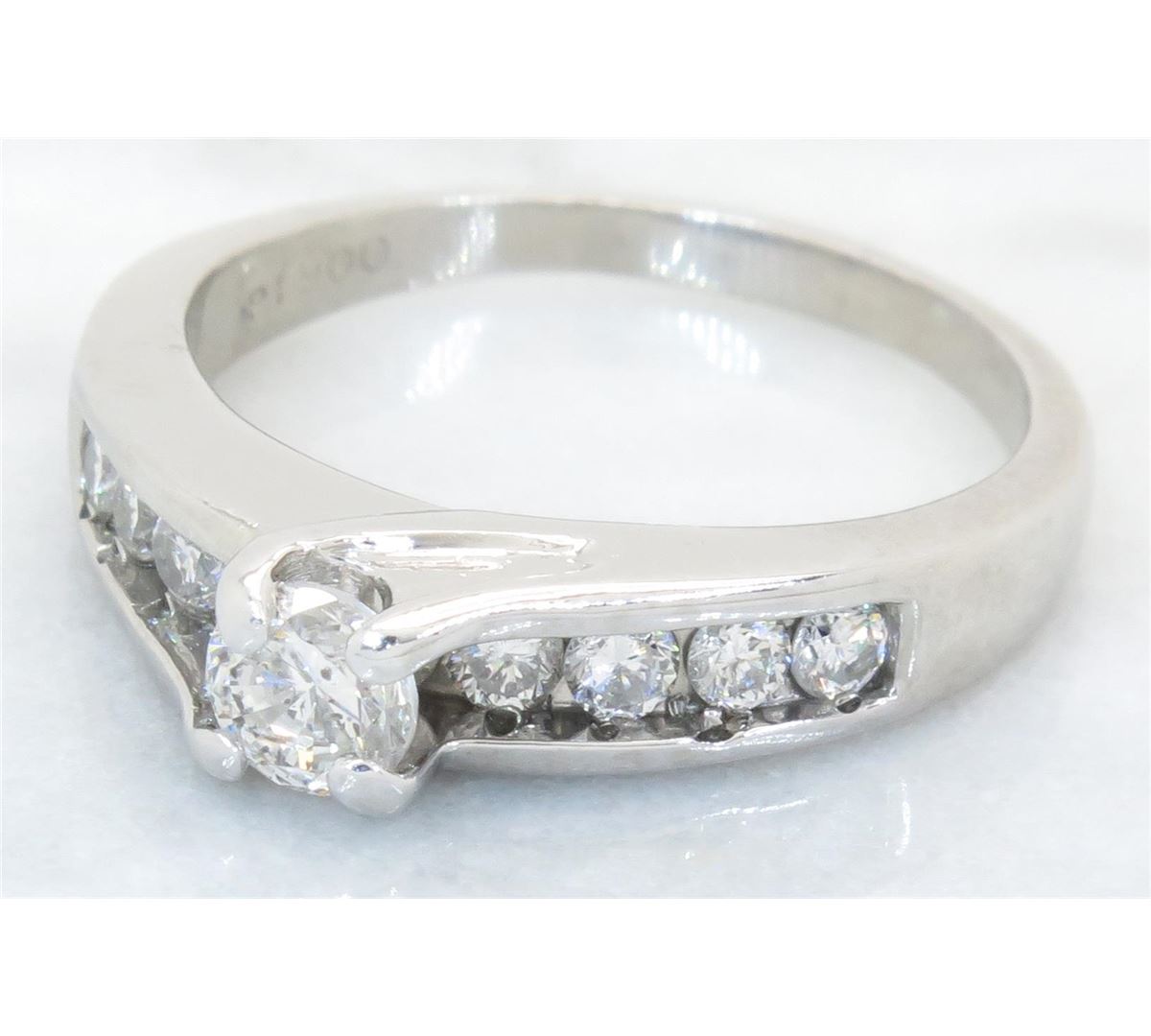 One tested platinum diamond ring. Containing: One Round Brilliant Cut Diamond. Approximate Size: .40CT, Clarity: I1, Color: G-H. 9 Round Brilliant Cut Diamonds. Approximate total diamond weight: .90CTW. All diamonds are graded in the mounting unless otherwise stated. Weight of ring: 8.2 grams, Size: 8.5.