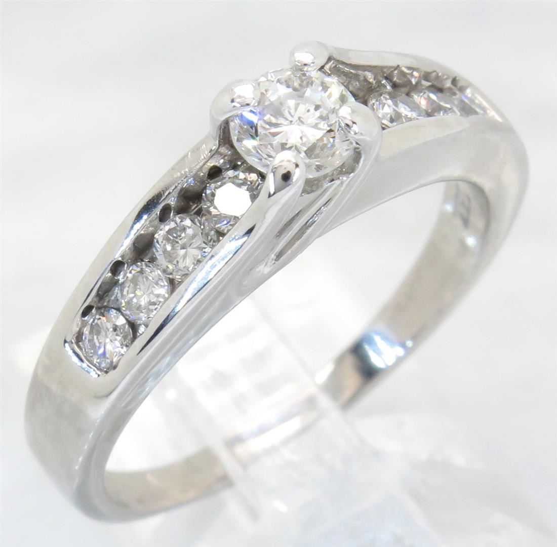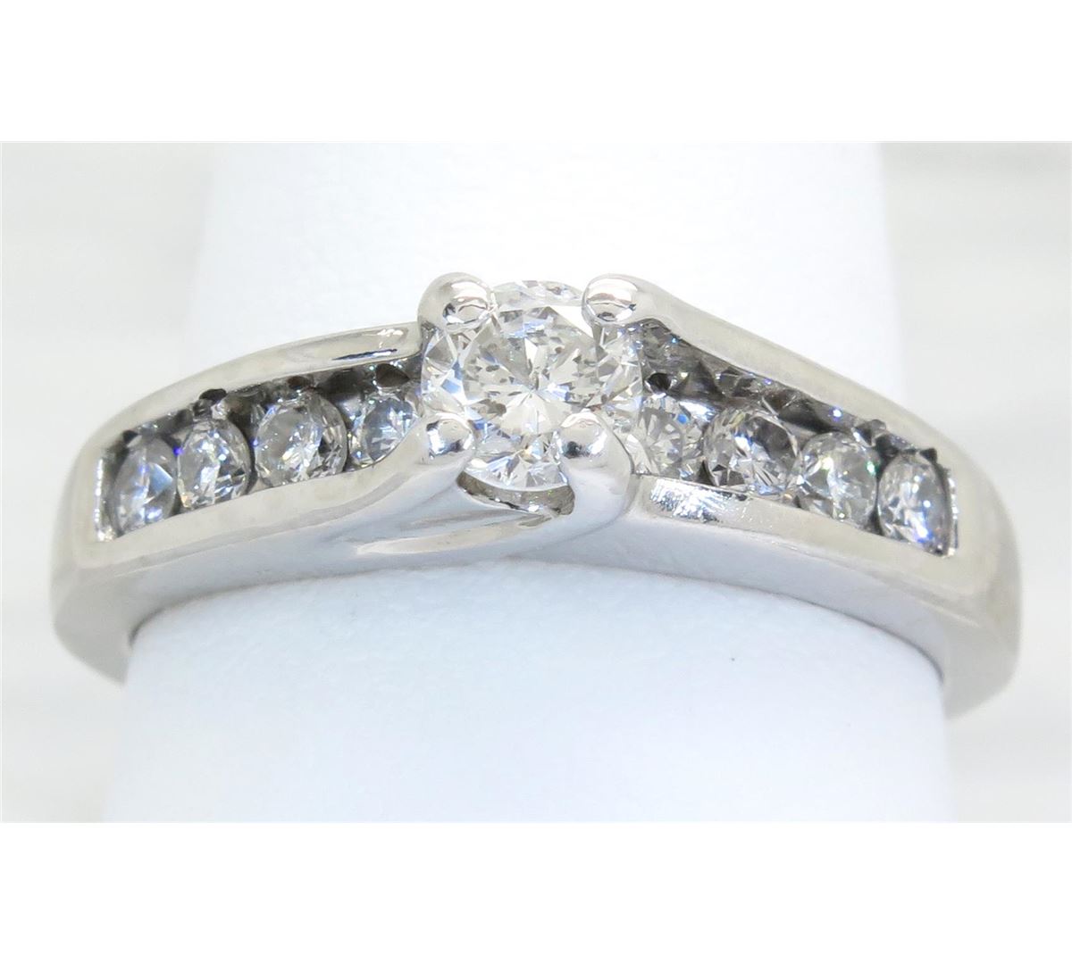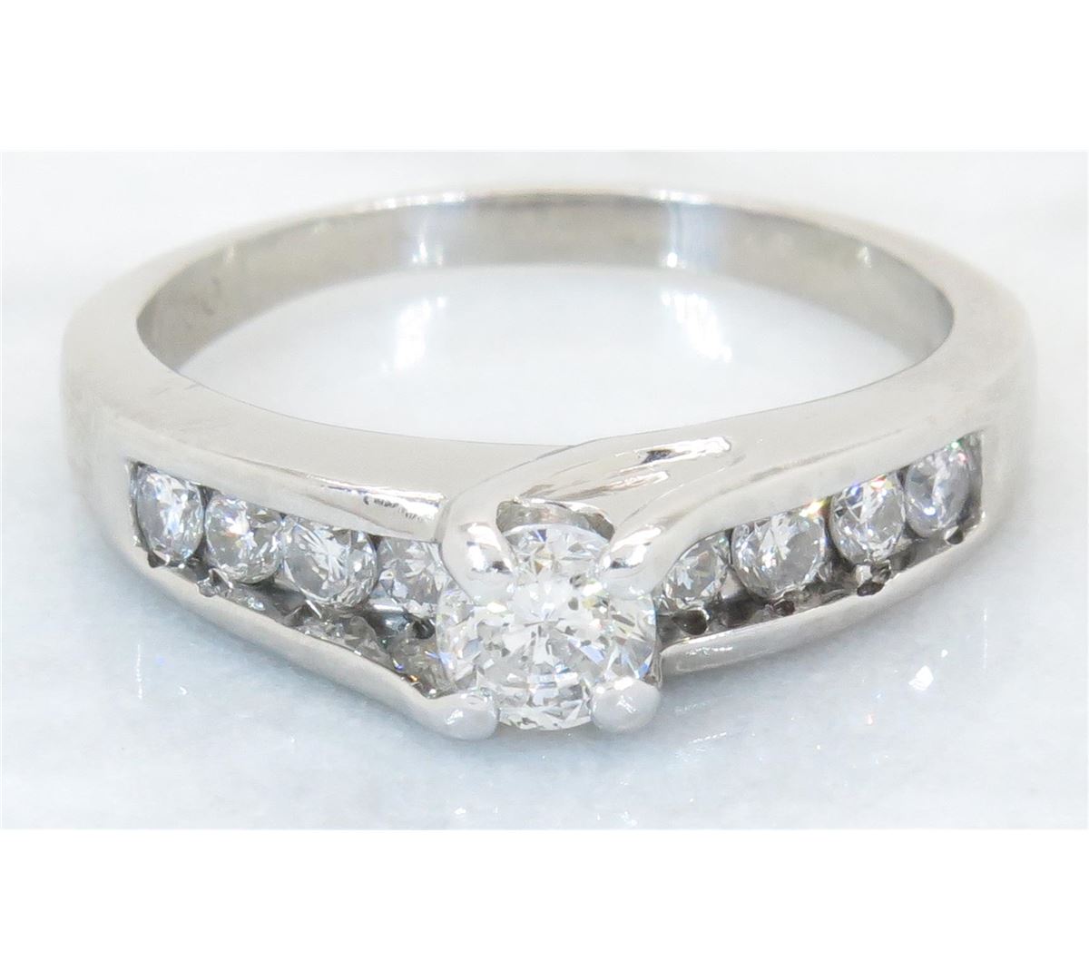 One tested platinum diamond ring. Containing: One Round Brilliant Cut Diamond. Approximate Size: .40CT, Clarity: I1, Color: G-H. 9 Round Brilliant Cut Diamonds. Approximate total diamond weight: .90CTW. All diamonds are graded in the mounting unless otherwise stated. Weight of ring: 8.2 grams, Size: 8.5.
