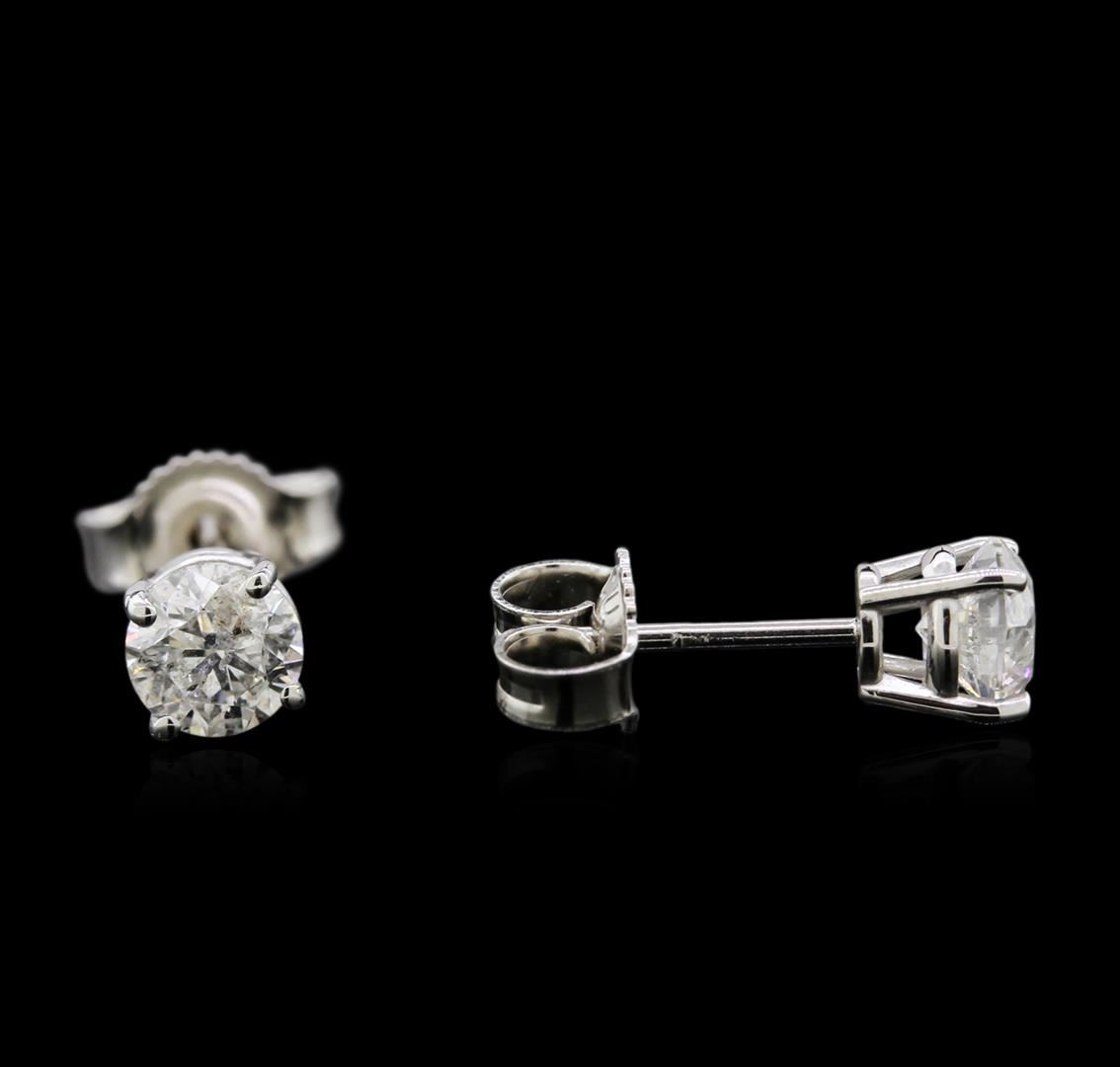 One pair electronically tested 14KT white gold lady's combination cast & assembled 4-prong stud earrings with heavy friction backs with a basket setting with a bright polish finish. Identified with markings of "14K". Condition is new, good workmanship. Containing: Two prong set round brilliant cut diamonds, measuring 4.74 - 4.73 x 3.08mm (depth est.) , 5.00% GTCF approximate total weight of 2 Stones = 0.90ct. Graded in the setting. Clarity: I-1. Color: H - I. Cut Good. Total Weight of Diamonds 0.90ct. Total Weight of Earrings 1.00gm. GAS Appraised.