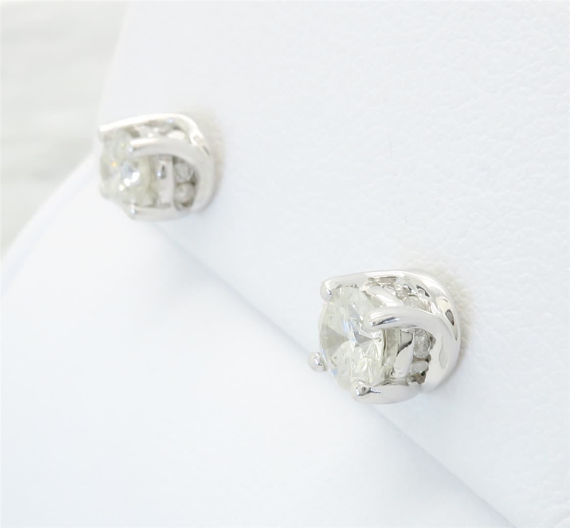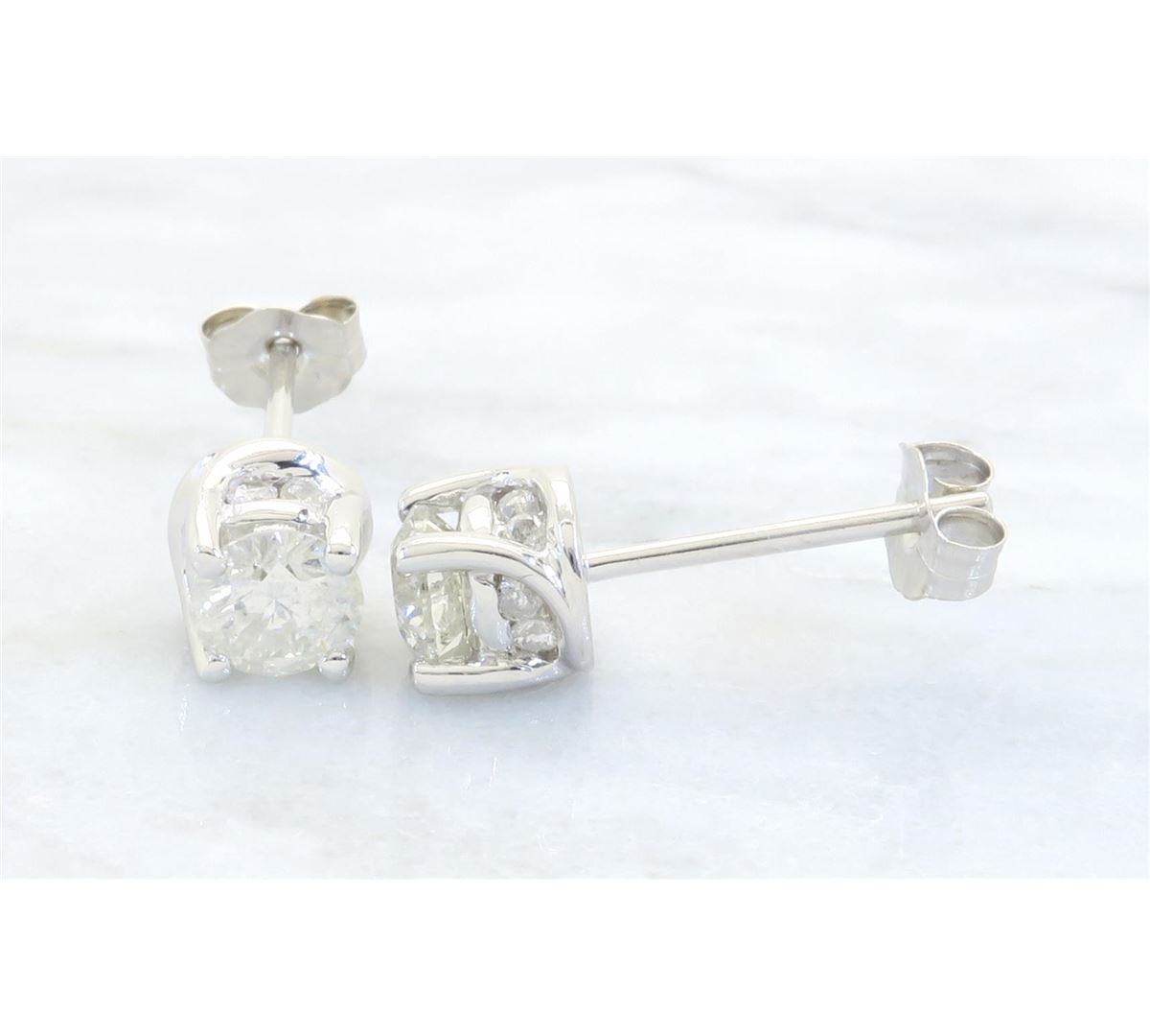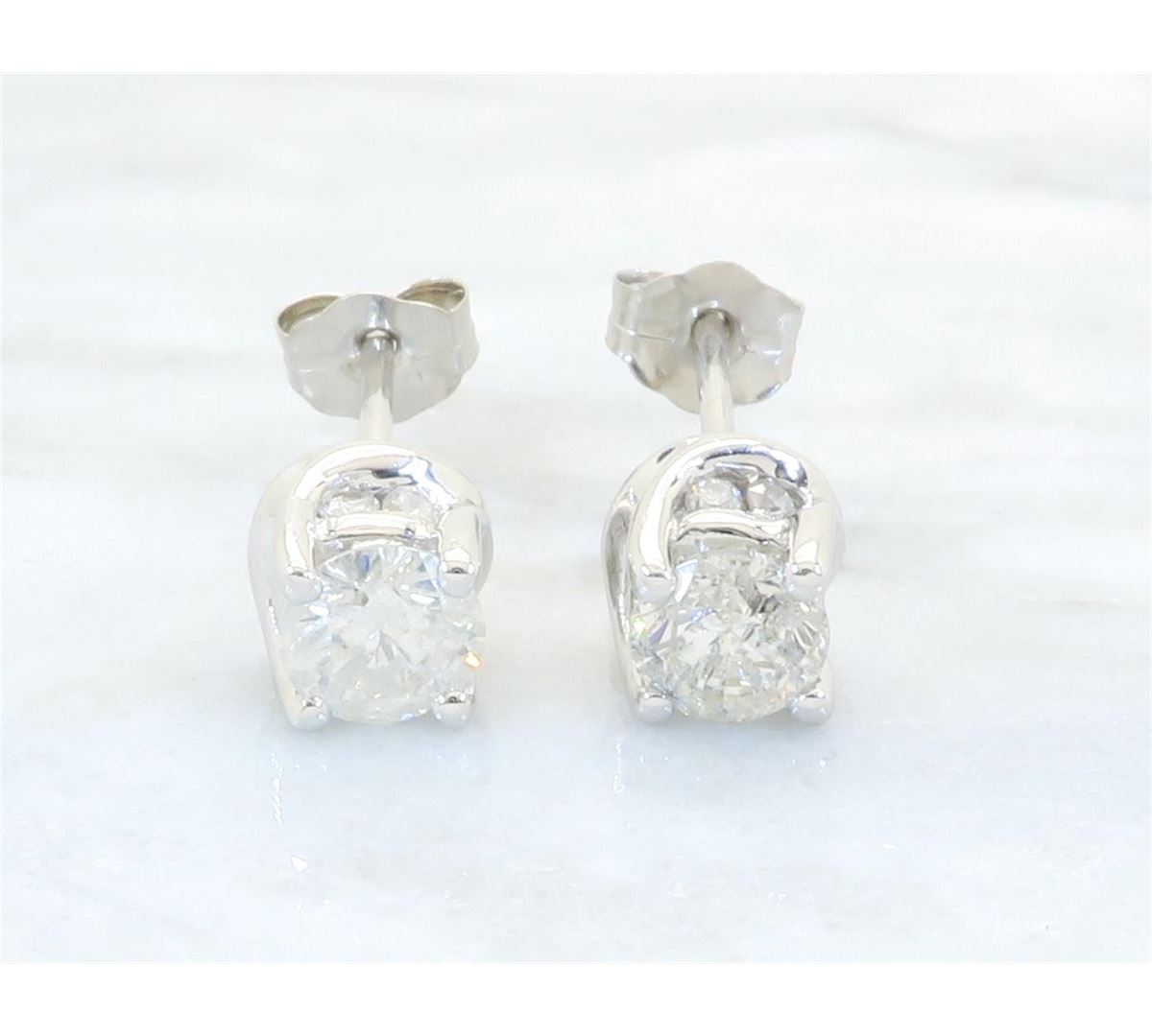 One pair of tested 14K white gold diamond earrings. Containing: Two Round Brilliant Cut Diamonds. Approximate size: .35CT and .39CT. Clarity: I, Color: I-J. 16 Round Brilliant Cut Diamonds. Approximate total diamond weight: .90CTW. All diamonds are graded in the mounting unless otherwise stated. Weight of earrings: 1.7 grams.
