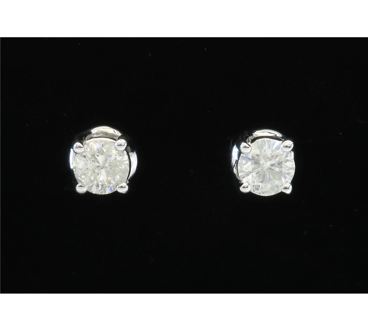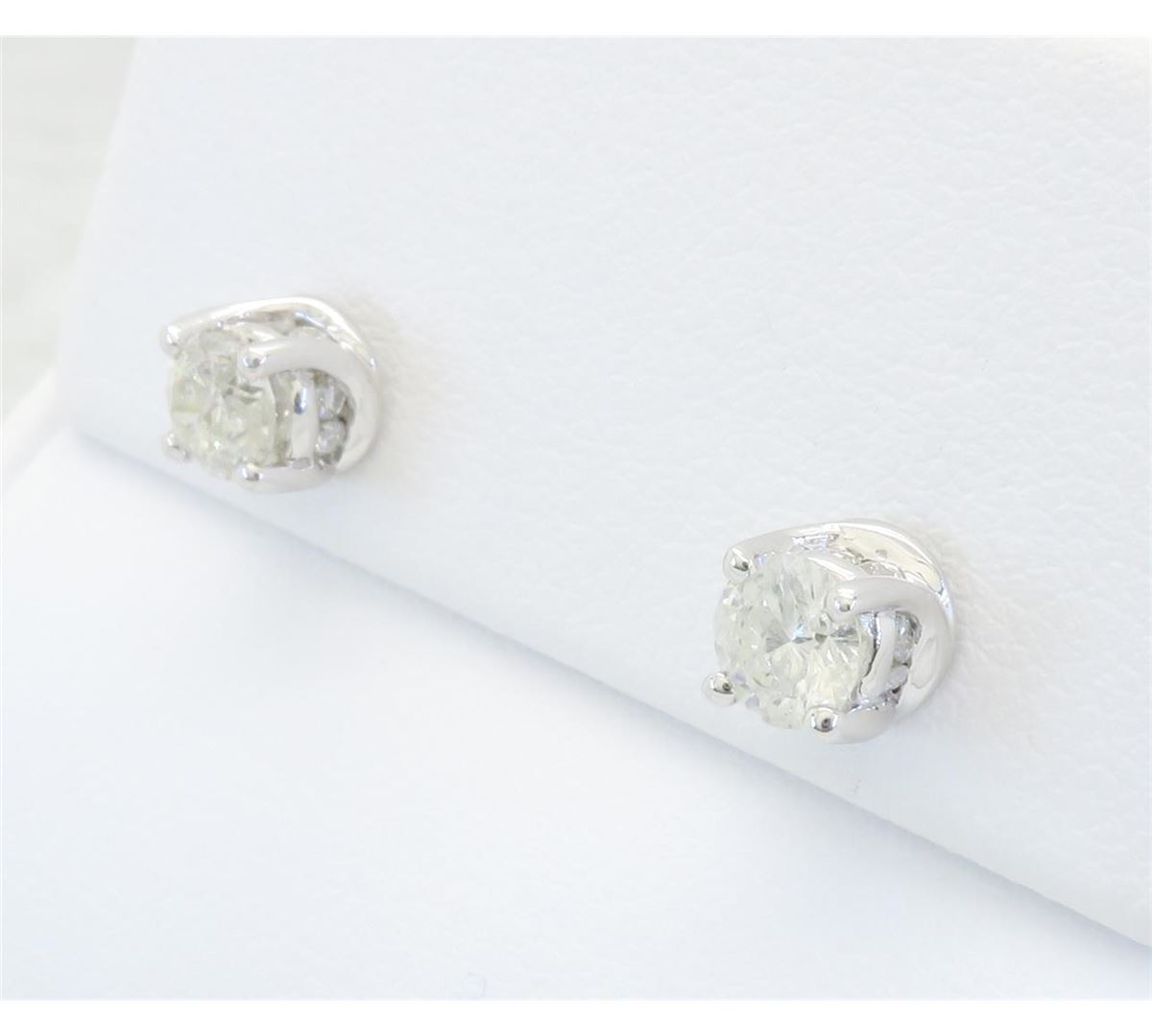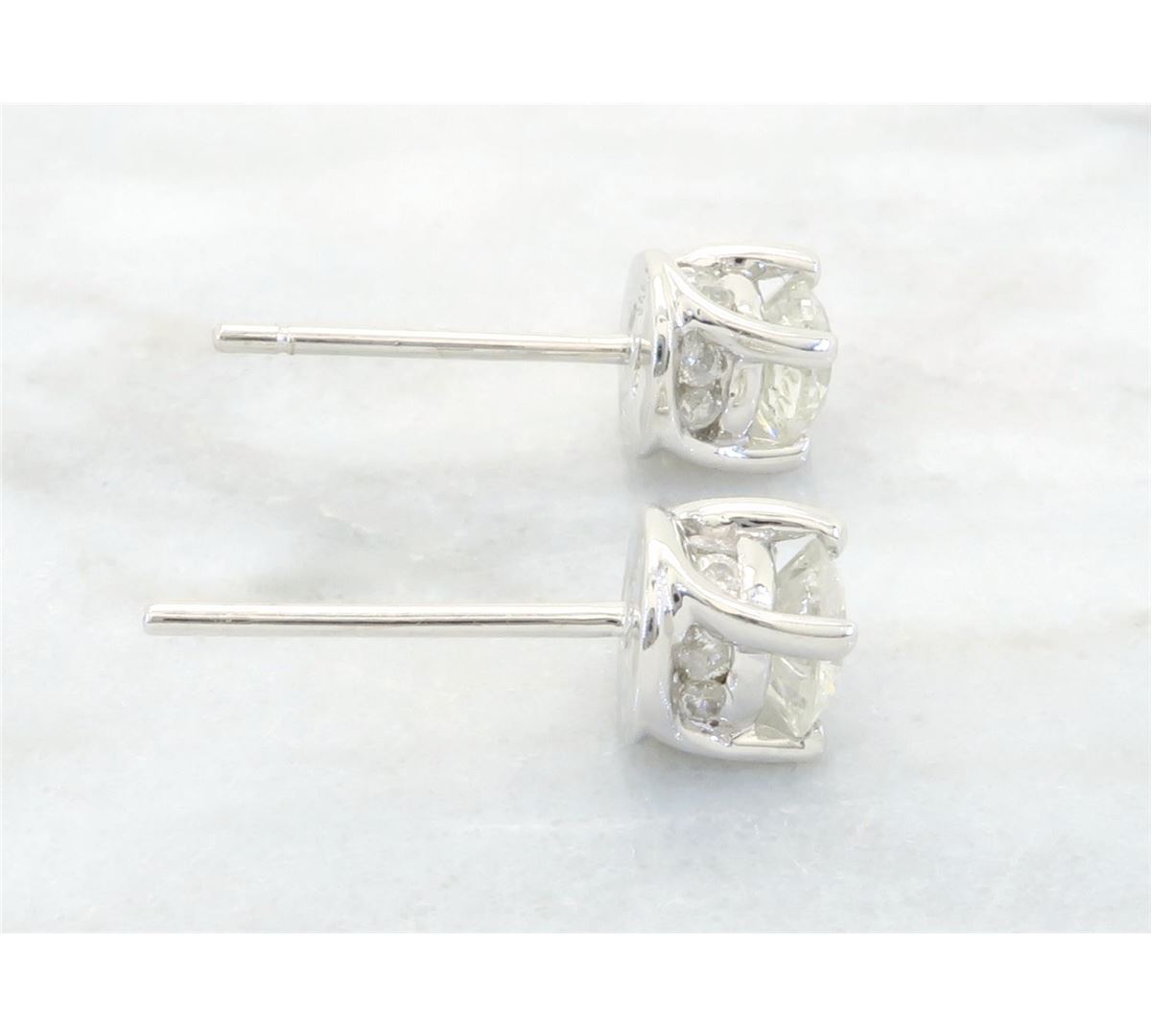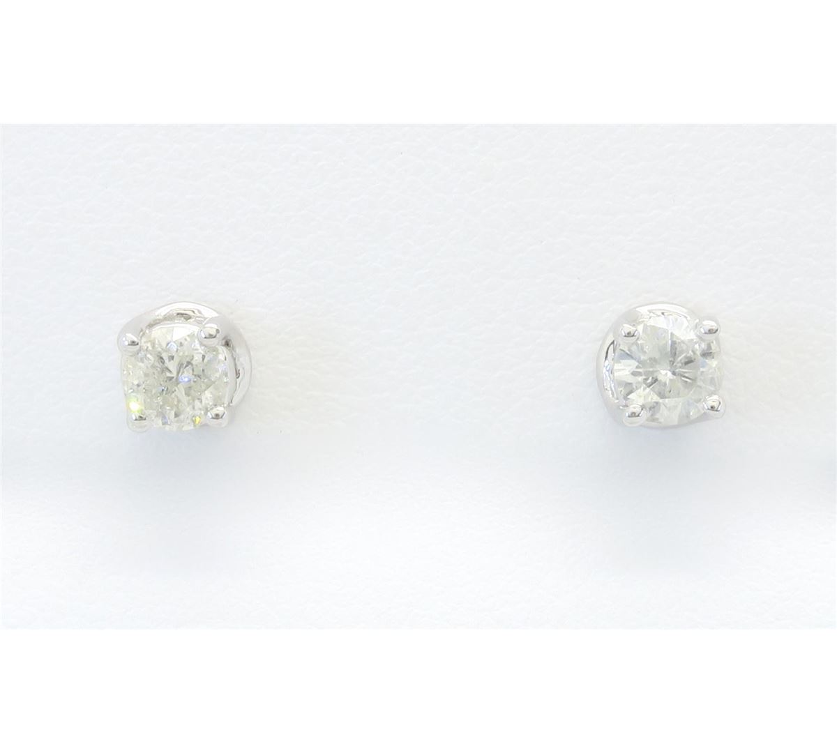One pair of tested 14K white gold diamond earrings. Containing: Two Round Brilliant Cut Diamonds. Approximate size: .35CT and .39CT. Clarity: I, Color: I-J. 16 Round Brilliant Cut Diamonds. Approximate total diamond weight: .90CTW. All diamonds are graded in the mounting unless otherwise stated. Weight of earrings: 1.7 grams.