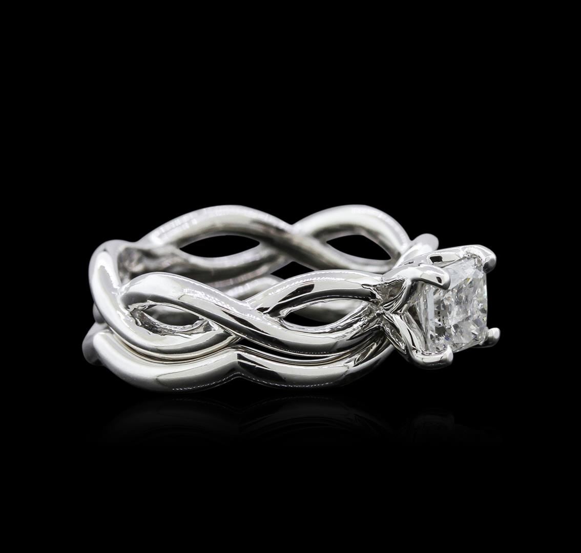 One electronically tested 18KT white gold ladies cast diamond wedding set. The wedding set includes a solitaire engagement ring and a matching wedding band. The wedding set is completed by combined bands measuring five millimeters wide. Bright polish finish. Identified with markings of "18K". Condition is new, good workmanship. Containing: One prong set princess cut diamond, measuring 4.95 x 4.95 x 4.00mm (depth est.) approximate weight of 0.90ct. Graded in the setting. Clarity I-2 Color I. Depth 80.8%. Table 76.8%. Total Weight of Diamonds 0.90ct. Total Weight of Wedding Set 6.41 grams. AIG Appraised at $3,825.00.