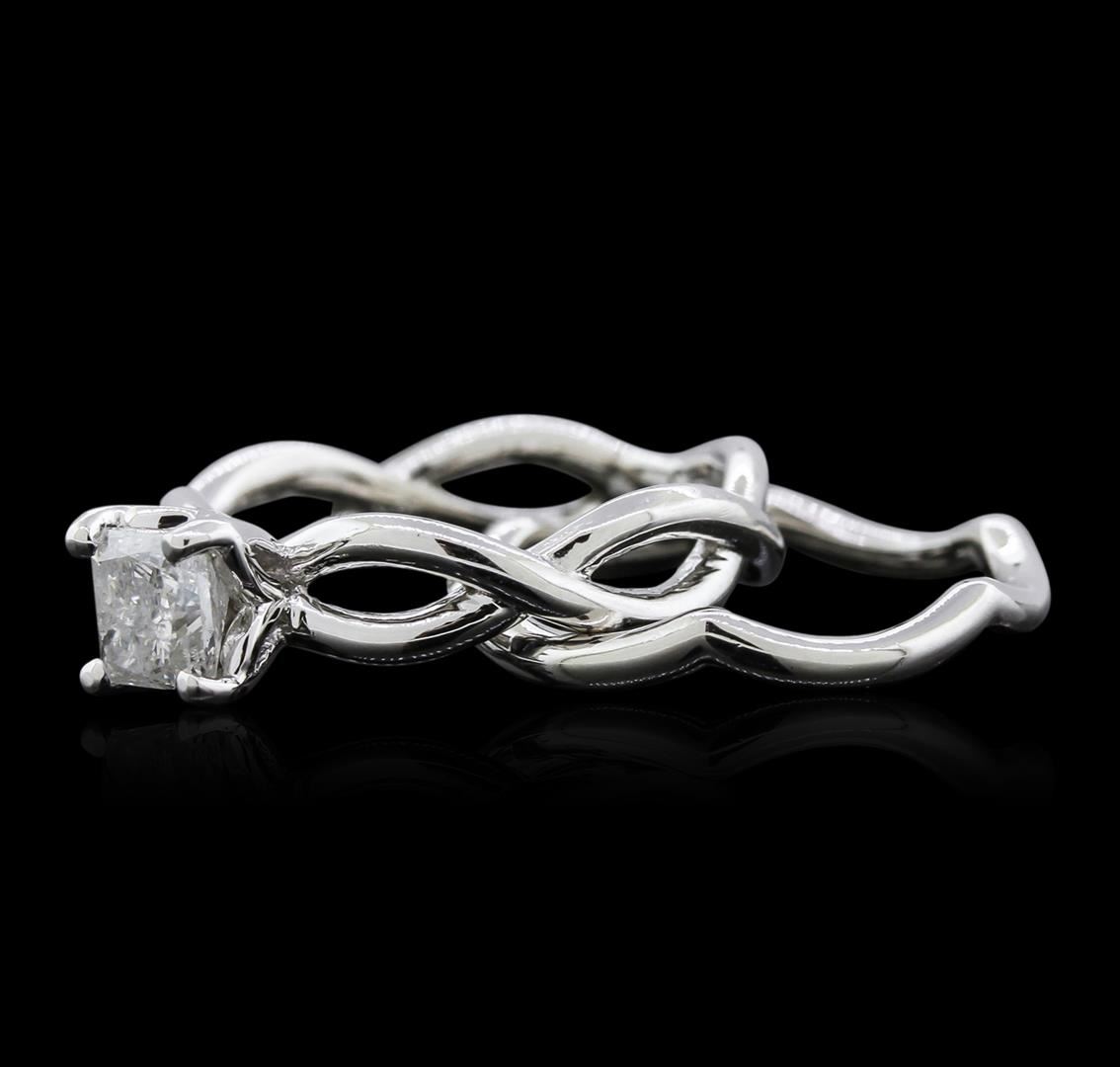 One electronically tested 18KT white gold ladies cast diamond wedding set. The wedding set includes a solitaire engagement ring and a matching wedding band. The wedding set is completed by combined bands measuring five millimeters wide. Bright polish finish. Identified with markings of "18K". Condition is new, good workmanship. Containing: One prong set princess cut diamond, measuring 4.95 x 4.95 x 4.00mm (depth est.) approximate weight of 0.90ct. Graded in the setting. Clarity I-2 Color I. Depth 80.8%. Table 76.8%. Total Weight of Diamonds 0.90ct. Total Weight of Wedding Set 6.41 grams. AIG Appraised at $3,825.00.
