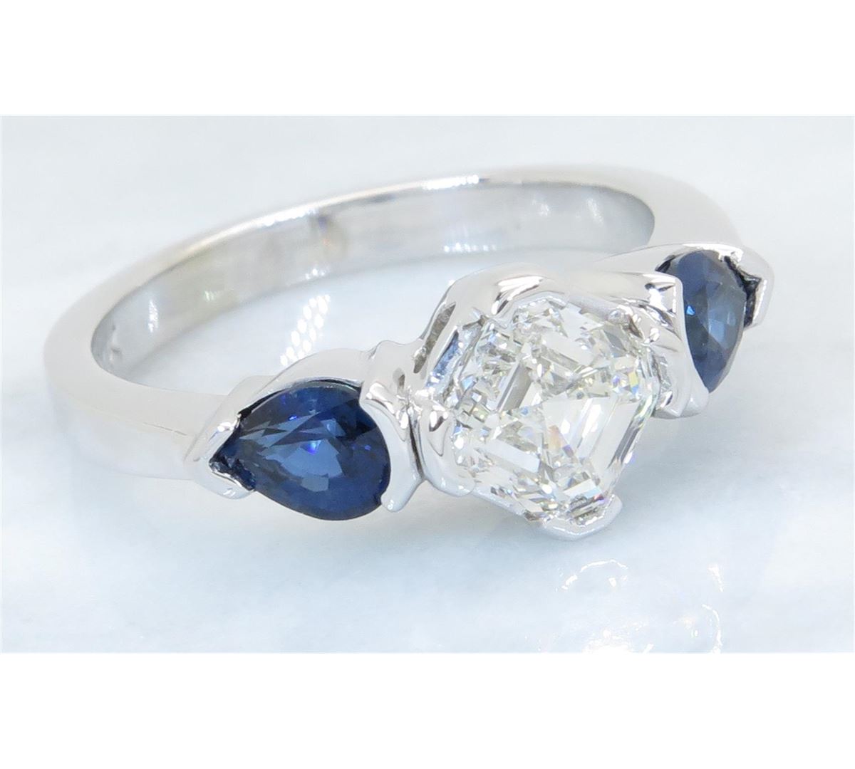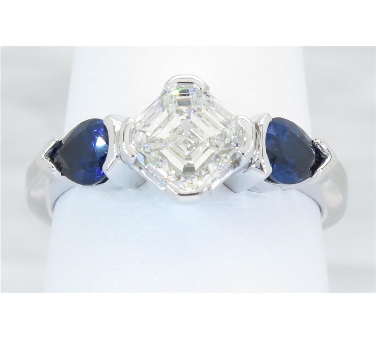 One tested 14K white gold diamond and sapphire ring. Containing: One Asscher Cut Diamond. Approximate Size: .90CT, Clarity: SI1, Color: G-H. Two pear shaped blue sapphires. Approximate total sapphire weight: .70CTW. All diamonds are graded in the mounting unless otherwise stated. Weight of ring: 4.1 grams, Size: 5.25.