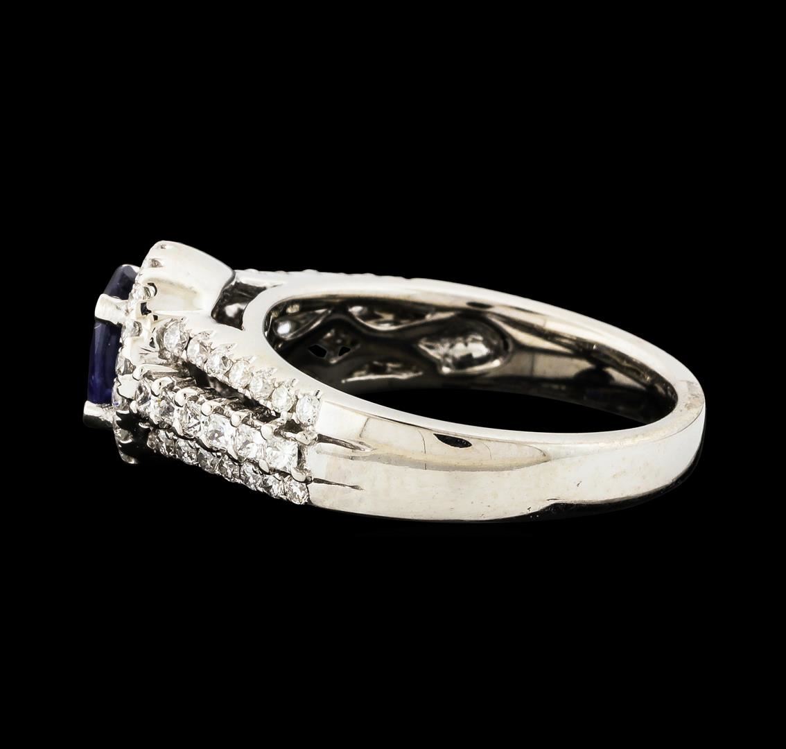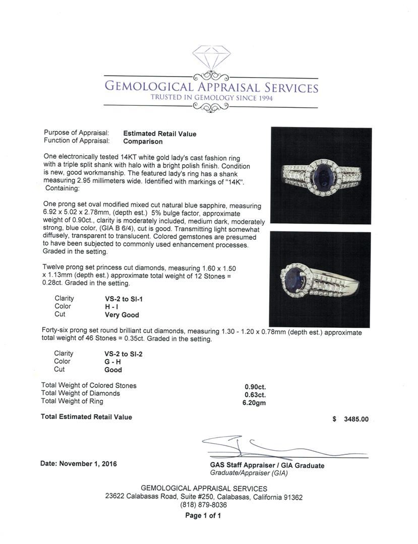 One electronically tested 14KT white gold lady's cast fashion ring with a triple split shank with halo with a bright polish finish. The featured lady's ring has a shank measuring 2.95 millimeters wide. Identified with markings of '14K'. Condition is new, good workmanship. Containing: One prong set oval modified mixed cut natural blue sapphire, measuring 6.92 x 5.02 x 2.78mm, (depth est.) 5%. bulge factor, approximate weight of 0.90ct., clarity is moderately included, medium dark, moderately strong, blue color, (GIA B 6/4), cut is good. Transmitting light somewhat diffusely, transparent to translucent. Colored gemstones are presumed to have been subjected to commonly used enhancement processes. Graded in the setting. Twelve prong set princess cut diamonds, measuring 1.60 x 1.50 x 1.13mm (depth est.) approximate total weight of 12 Stones = 0.28ct. Graded in the setting. Clarity VS-2 to SI-1. Color: H - I Cut Very Good Forty-Six prong set round brilliant cut diamonds, measuring 1.30 - 1.20 x 0.78mm (depth est.) approximate total weight of 46 Stones = 0.35ct. Graded in the setting. Clarity VS-2 to SI-2. Color: G - H Cut Good. Total Weight of Colored Stones 0.90ct.. Total Weight of Diamonds 0.63ct.. Total Weight of Ring 6.20gm. GAS Appraised at $3,485.00.