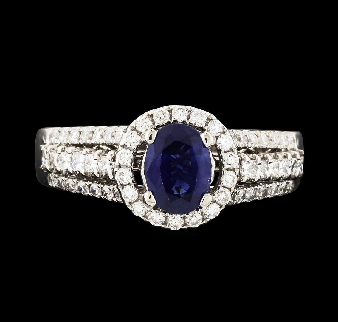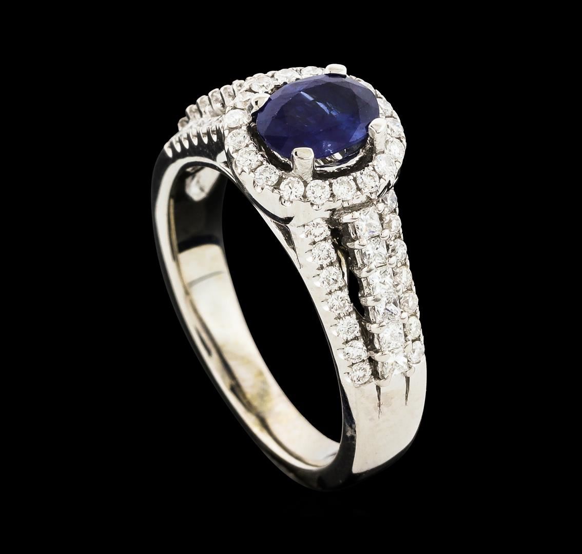 One electronically tested 14KT white gold lady's cast fashion ring with a triple split shank with halo with a bright polish finish. The featured lady's ring has a shank measuring 2.95 millimeters wide. Identified with markings of '14K'. Condition is new, good workmanship. Containing: One prong set oval modified mixed cut natural blue sapphire, measuring 6.92 x 5.02 x 2.78mm, (depth est.) 5%. bulge factor, approximate weight of 0.90ct., clarity is moderately included, medium dark, moderately strong, blue color, (GIA B 6/4), cut is good. Transmitting light somewhat diffusely, transparent to translucent. Colored gemstones are presumed to have been subjected to commonly used enhancement processes. Graded in the setting. Twelve prong set princess cut diamonds, measuring 1.60 x 1.50 x 1.13mm (depth est.) approximate total weight of 12 Stones = 0.28ct. Graded in the setting. Clarity VS-2 to SI-1. Color: H - I Cut Very Good Forty-Six prong set round brilliant cut diamonds, measuring 1.30 - 1.20 x 0.78mm (depth est.) approximate total weight of 46 Stones = 0.35ct. Graded in the setting. Clarity VS-2 to SI-2. Color: G - H Cut Good. Total Weight of Colored Stones 0.90ct.. Total Weight of Diamonds 0.63ct.. Total Weight of Ring 6.20gm. GAS Appraised at $3,485.00.