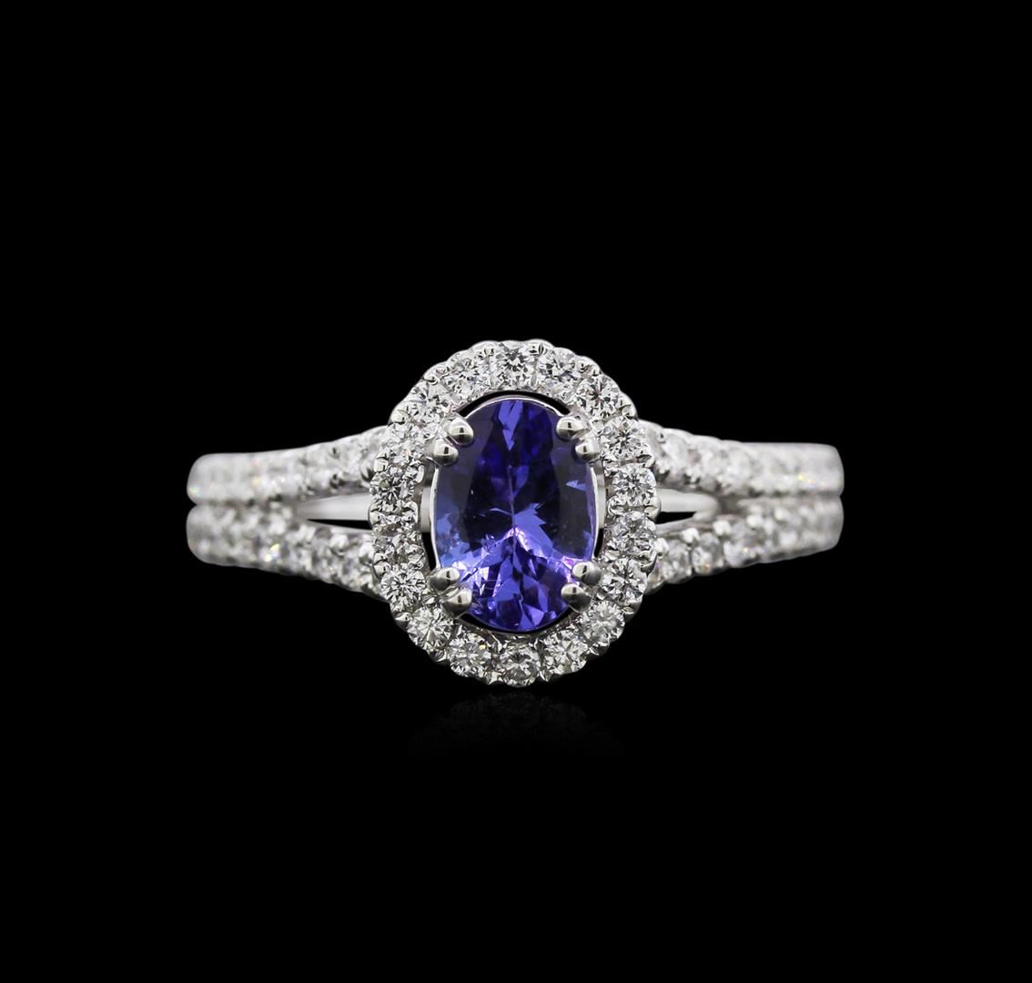 One electronically tested 18KT white gold ladies cast tanzanite and diamond ring with a bright polish finish. The featured tanzanite is set within a diamond bezel supported by an elaborate diamond set under gallery and diamond set split shoulders, completed by a two and one-half millimeter wide band. Identified with markings of "18K 750". Condition is good. Containing: One prong set oval mixed cut natural tanzanite, measuring 6.90 x 4.75 x 3.25mm, 30% bulge factor, approximate weight of 0.90ct., clarity is slightly included, type I, medium dark, very slightly grayish, bluish violet color, (GIA bV 6/3), cut is good. Transmitting light with a minimum of distortion, transparent. Naturally occurring internal & external characteristics are present. Graded in the setting. Tanzanite is a very rare gemstone that is only found in the country of Tanzania. Originally discovered in 1967. Tiffany & Company, named the stone Tanzanite. It is found in the Usumburu Mountains that border the Umba Valley of northern Tanzania. Tanzanite occurs in gray, brown, violet, blue, reddish-purple, & green. The gem is interesting because of its exceptional pleochroism. Rotated in different directions a tanzanite will exhibit multiple changes of color. Tanzanite has a low tolerance to ultrasonic cleaning, and should not be cleaned using this method. Fifty-Eight prong set round brilliant cut diamonds, measuring 1.50 - 1.40 x 0.87mm (depth est.) approximate total weight of 58 Stones = 0.65ct. Graded in the setting. Clarity: SI-1 to I-1. Color: G - I Twenty-Eight prong set round brilliant cut diamonds, measuring 0.90 - 0.80 x 0.51mm (depth est.) approximate total weight of 28 Stones = 0.07ct. Graded in the setting. Clarity: SI-1 to I-1. Color: G - I. Total Weight of Colored Stones 0.90ct. Total Weight of Diamonds 0.72ct. Total Weight of Ring 5.88gm. AIG Appraised at $4,760.00.