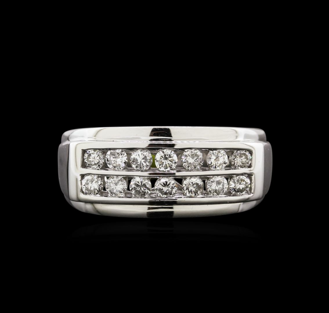 One electronically tested 14KT white gold man's cast fashion ring with a tapered shank with a bright polish finish. Condition is new. Identified with markings of "14K". Containing: Fourteen channel set round brilliant cut diamonds, measuring 2.50 - 2.45 x 1.61mm (depth est.), 4.00% GTCF approximate total weight of 14 Stones = 0.90ct. Graded in the setting. Clarity: SI-2 to I-1. Color: G - I. Cut: Good. Total Weight of Diamonds: 0.90ct. Total Weight of Ring: 8.40 gm. GAS Appraised at $4,705.00.