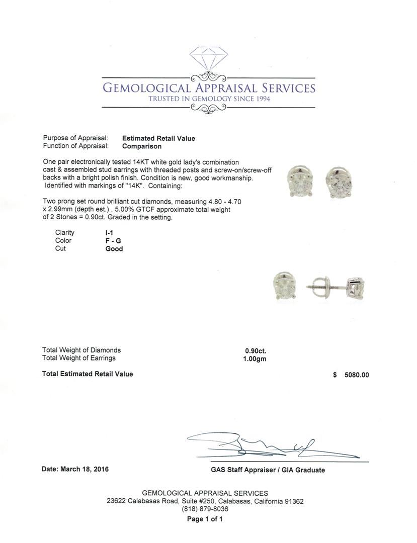 One pair electronically tested 14KT white gold lady's combination cast & assembled stud earrings with threaded posts and screw-on/screw-off backs with a bright polish finish. Identified with markings of "14K". Condition is new, good workmanship. Containing: Two prong set round brilliant cut diamonds, measuring 4.80 - 4.70 x 2.99mm (depth est.) , 5.00.%. GTCF approximate total weight of 2 Stones = 0.90ct. Graded in the setting. Clarity: I-1. Color: F - Good. Total Weight of Diamonds 0.90ct. Total Weight of Earrings 1.00gm. GAS Appraised at $5,080.00.