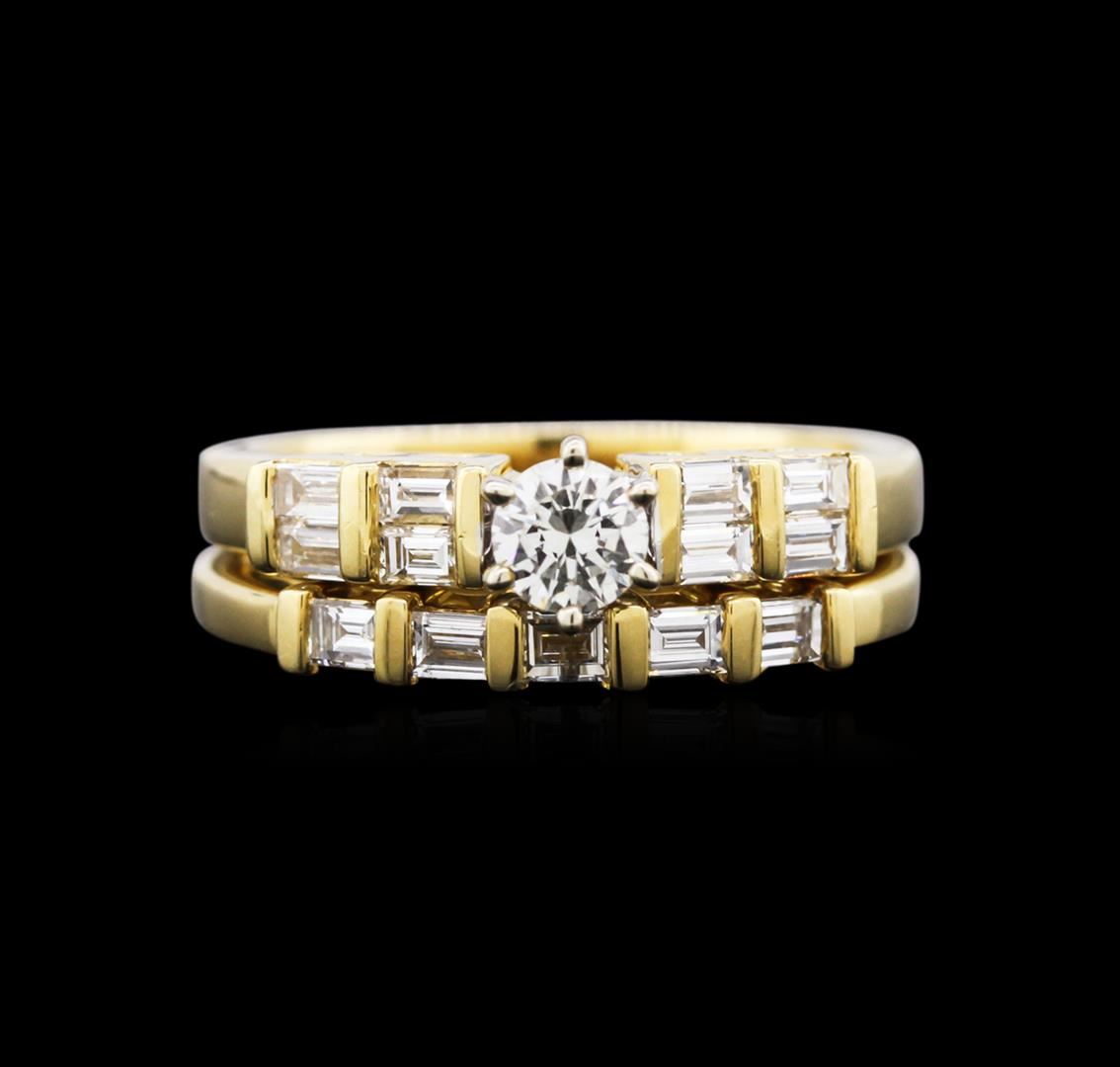 One wedding ring set featuring: 18KT yellow gold weighing 4.80 grams containing one diamond center stone with a total weight of 0.26ct and 13 baguette cut diamonds with a total weight of 0.64ct.