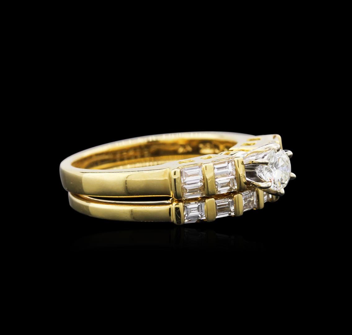 One wedding ring set featuring: 18KT yellow gold weighing 4.80 grams containing one diamond center stone with a total weight of 0.26ct and 13 baguette cut diamonds with a total weight of 0.64ct.