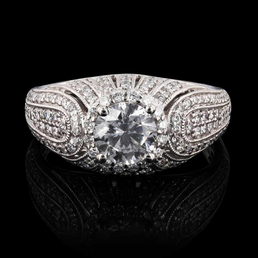 One polished, stamped, and tested platinum ring with a bright finish. The ring is mounted with 1 genuine diamond center stone weighing approximately 0.91 carat, and 124 genuine round diamonds weighing approximately 0.60 carats. This item weighs 7.0 grams, condition is new, excellent workmanship. MAIN GEMSTONE Identity: Natural Diamond Shape: Round Cutting Style: Brilliant Cut Average Diameter: 6.0mm Depth: 3.7mm Weight: 0.91 carat Color Grade: G Clarity Grade: I2 Polish: Excellent Symmetry: Very Good Refractive Index: 2.417 Hardness: 10 ADJACENT GEMSTONES ON RING Identity: Natural Diamond Shape: Round Cutting Style: Brilliant Cut Quantity: 124 Diamonds Measurements: 0.9mm to 1.1mm Total Weight: 0.60 carats Color Grade: F - G Clarity Grade: VS2 to SI1 Refractive Index: 2.418 Hardness: 10 CENTER DIAMOND WEIGHT: 0.91 ctw TOTAL DIAMOND WEIGHT: 1.51 ctw WEIGHT OF ITEM: 7.0 grams METAL: Platinum