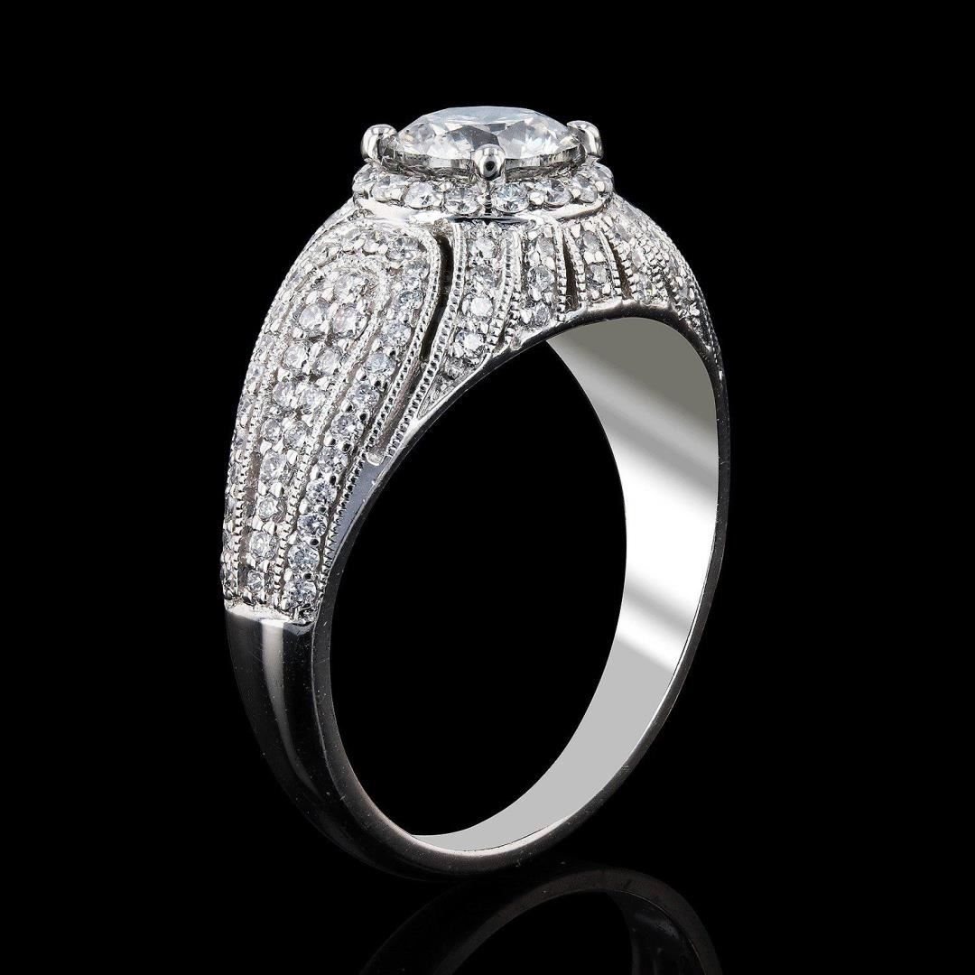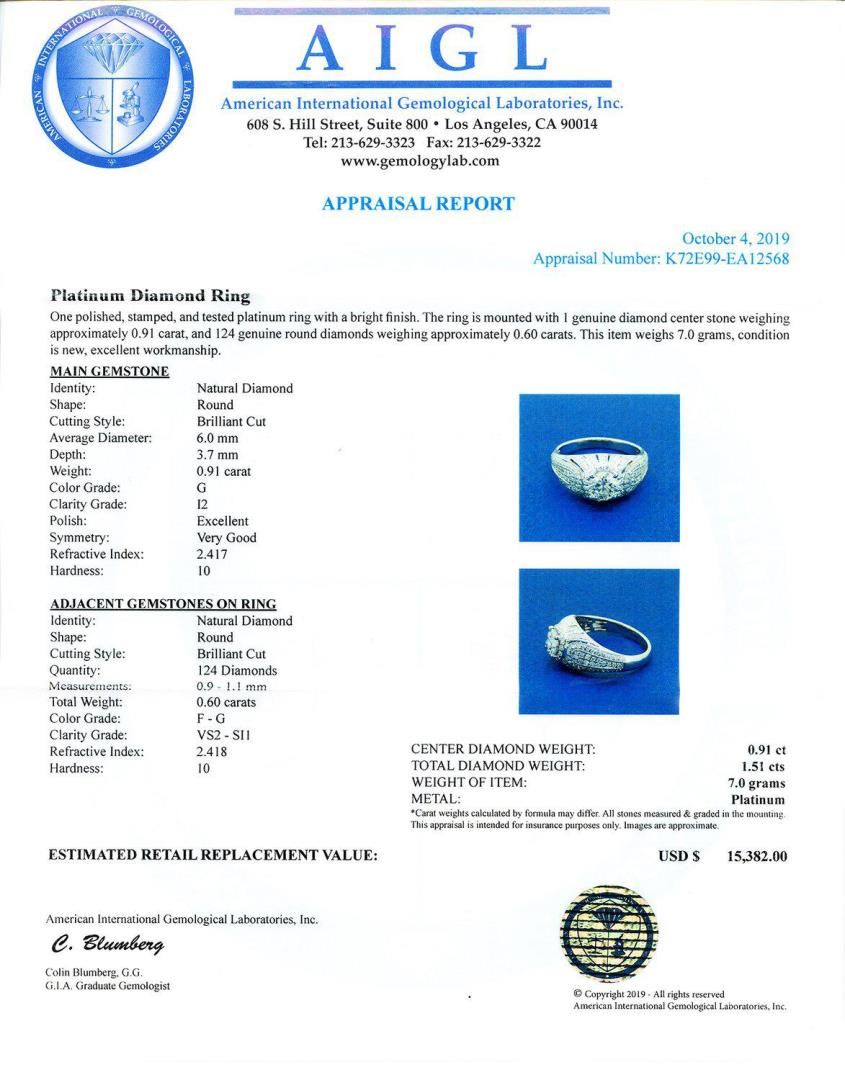 One polished, stamped, and tested platinum ring with a bright finish. The ring is mounted with 1 genuine diamond center stone weighing approximately 0.91 carat, and 124 genuine round diamonds weighing approximately 0.60 carats. This item weighs 7.0 grams, condition is new, excellent workmanship. MAIN GEMSTONE Identity: Natural Diamond Shape: Round Cutting Style: Brilliant Cut Average Diameter: 6.0mm Depth: 3.7mm Weight: 0.91 carat Color Grade: G Clarity Grade: I2 Polish: Excellent Symmetry: Very Good Refractive Index: 2.417 Hardness: 10 ADJACENT GEMSTONES ON RING Identity: Natural Diamond Shape: Round Cutting Style: Brilliant Cut Quantity: 124 Diamonds Measurements: 0.9mm to 1.1mm Total Weight: 0.60 carats Color Grade: F - G Clarity Grade: VS2 to SI1 Refractive Index: 2.418 Hardness: 10 CENTER DIAMOND WEIGHT: 0.91 ct TOTAL DIAMOND WEIGHT: 1.51 cts WEIGHT OF ITEM: 7.0 grams METAL: Platinum Size: 7