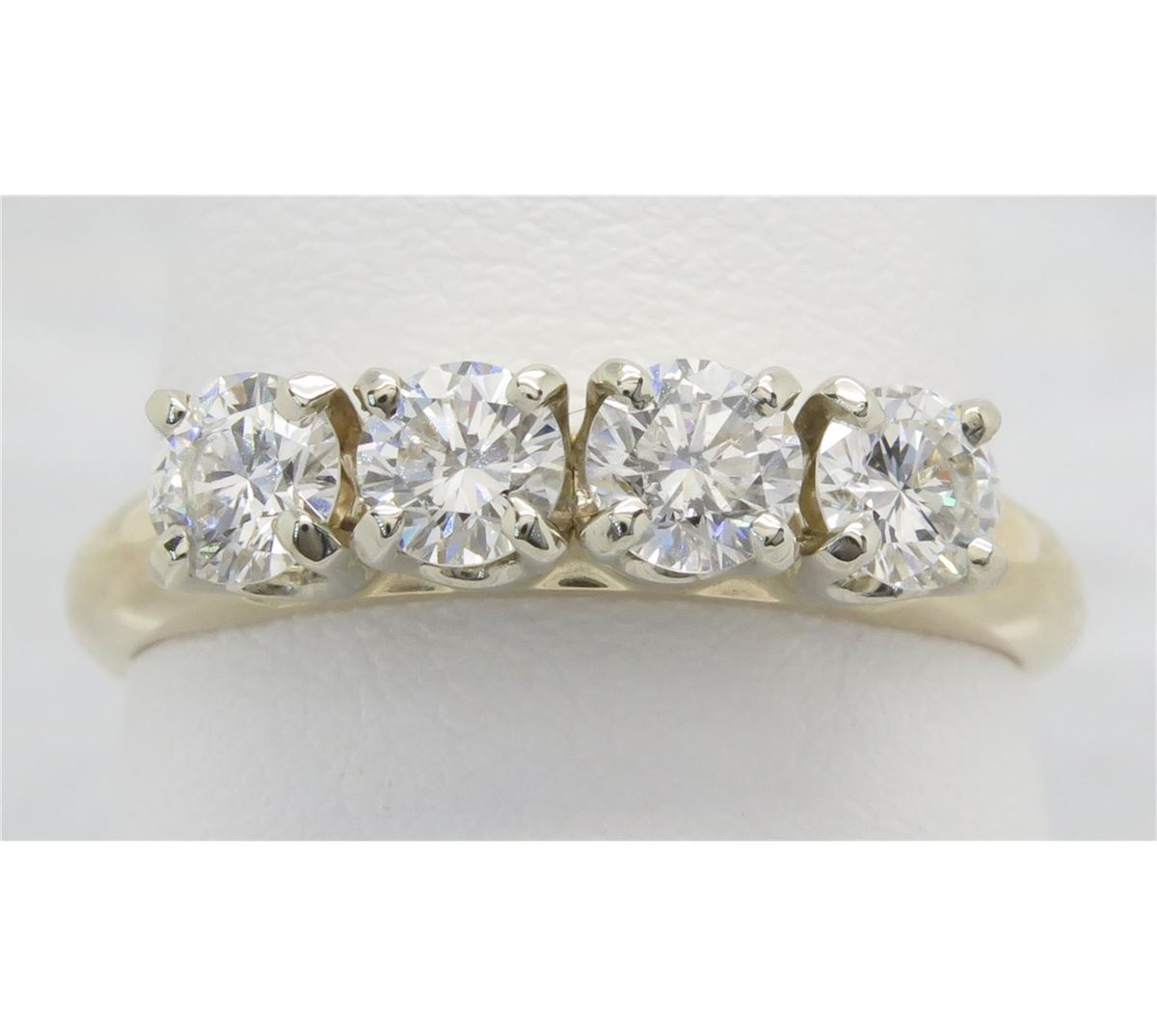 One tested 14K yellow gold diamond ring. Containing: Four Round Brilliant Cut Diamonds. Clarity: SI, Color: G-I. Approximate total diamond weight: .91CTW. Diamonds are graded in the mounting, unless otherwise stated. Weight: 3.7 grams, Size: 7.75.