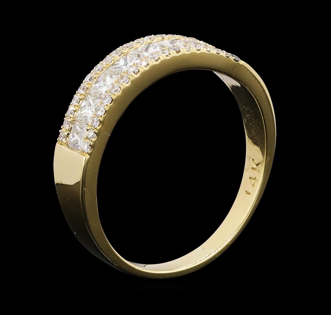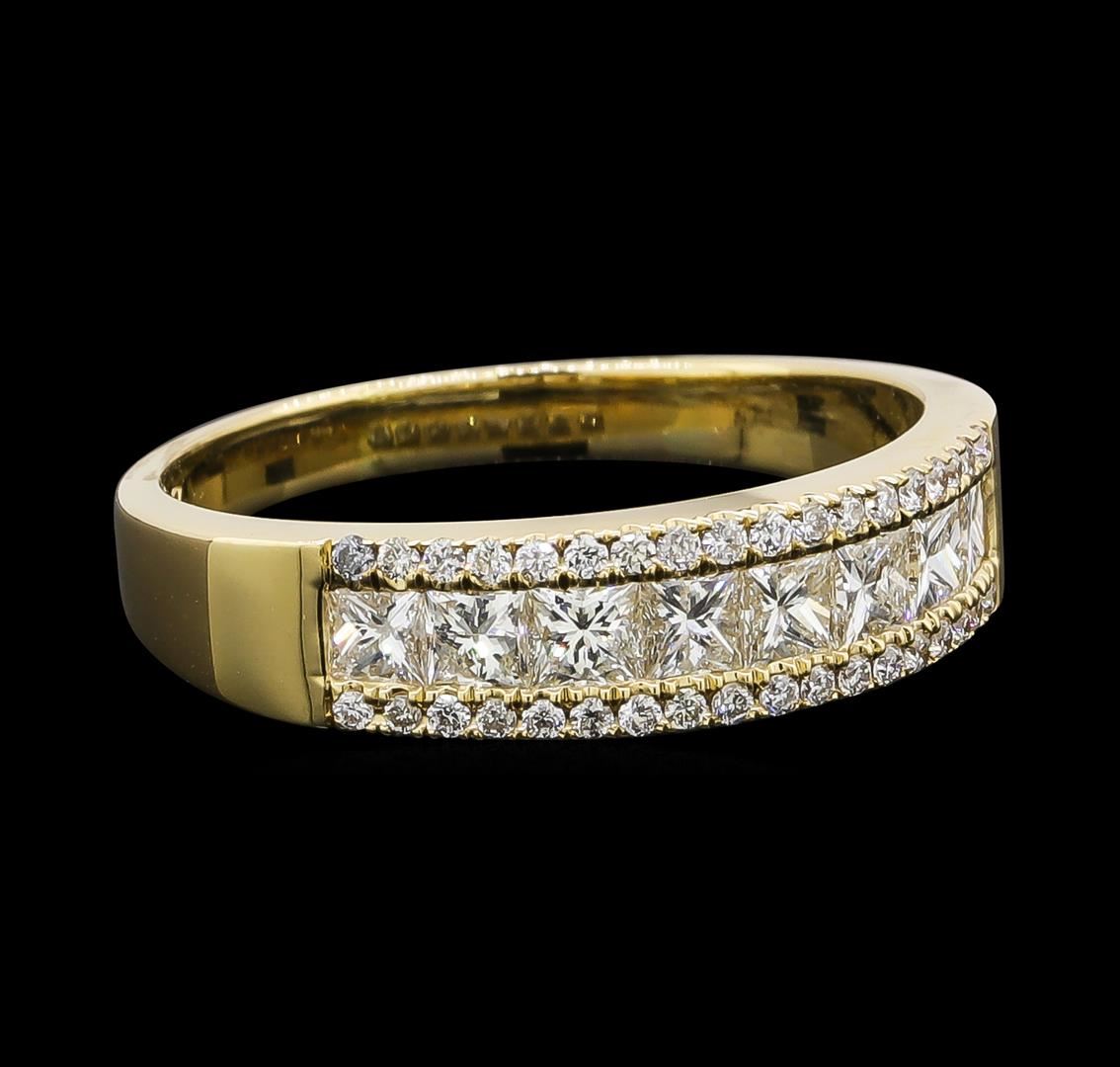 One electronically tested 14KT yellow gold lady's cast fashion ring with a tapered shank with a bright polish finish. The featured lady's ring has a shank measuring 2.23 millimeters wide. Identified with markings of '14K'. Condition is new, good workmanship. Containing: Eight channel set princess cut diamonds, measuring 2.50 x 2.40 x 1.87mm (depth est.) approximate total weight of 8 Stones = 0.75ct. Graded in the setting. Clarity VVS-1 to SI-1. Color: H - I Cut Good Thirty-Six prong set round brilliant cut diamonds, measuring 1.10 - 1.00 x 0.65mm (depth est.) approximate total weight of 36 Stones = 0.16ct. Graded in the setting. Clarity SI-1 to I-1. Color: G - H Cut Good. Total Weight of Diamonds 0.91ct.. Total Weight of Ring 2.90gm. GAS Appraised at $2,985.00.