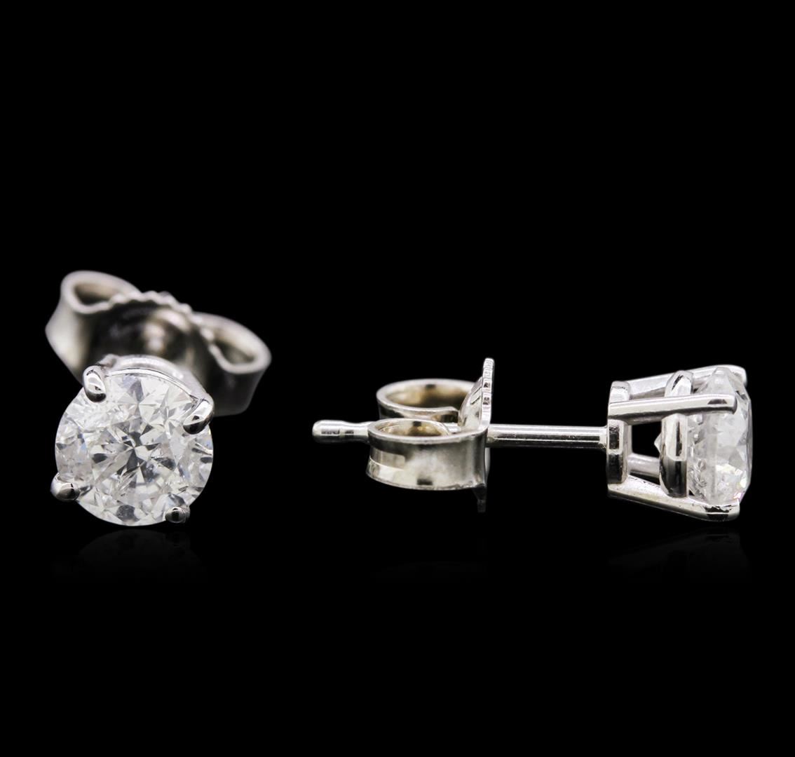 One pair electronically tested 14KT white gold lady's combination cast & assembled stud earrings with friction posts with a basket setting with a bright polish finish. Identified with markings of "14K". Condition is new, good workmanship. Containing: Two prong set round brilliant cut diamonds, measuring 5.05 - 4.84 x 2.97mm (depth est.) approximate total weight of 2 Stones = 0.91ct. Graded in the setting. Clarity: I-1. Color: H - I. Cut Good. Total Weight of Diamonds 0.91ct. Total Weight of Earrings 1.10gm. GAS Appraised at $3,390.00.