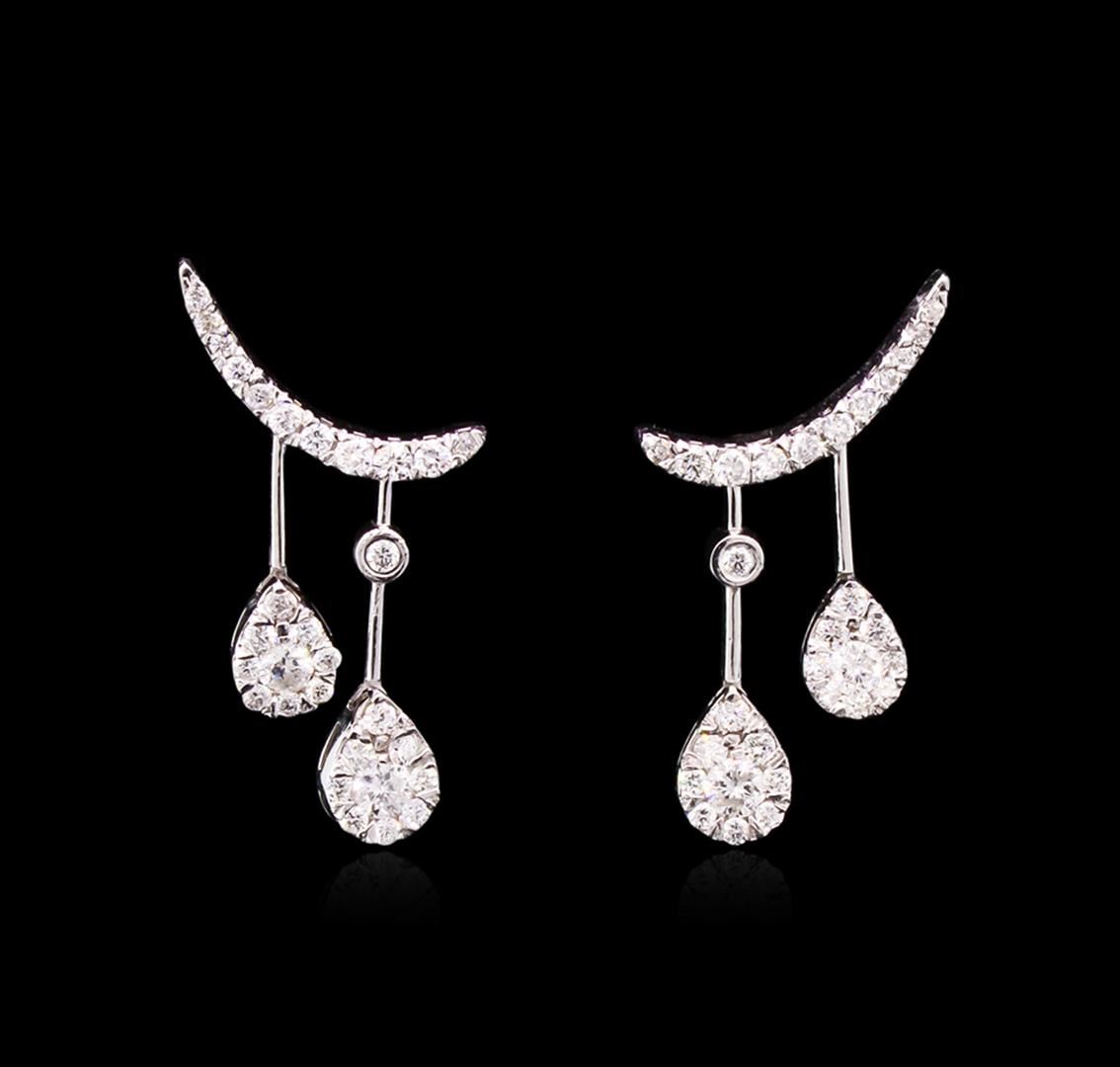 One pair of earrings featuring: 14KT white gold weighing 4.57 grams containing 2 center round diamonds with a total weight of 0.18ct and 56 side diamonds with a total weight of 0.73ct.