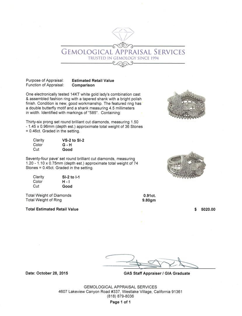 One electronically tested 14KT white gold lady's combination cast & assembled fashion ring with a tapered shank with a bright polish finish. The featured ring has a double butterfly motif and a shank measuring 4.5 millimeters in width. Identified with markings of "585". Condition is new, good workmanship. Containing: Thirty-Six prong set round brilliant cut diamonds, measuring 1.50 - 1.45 x 0.96mm (depth est.) approximate total weight of 36 Stones = 0.46ct. Graded in the setting. Clarity: VS-2 to SI-2. Color: G - Good Seventy-Four pave' set round brilliant cut diamonds, measuring 1.20 - 1.10 x 0.75mm (depth est.) approximate total weight of 74 Stones = 0.45ct. Graded in the setting. Clarity: SI-2 to I-1. Color: H - I. Cut Good. Total Weight of Diamonds 0.91ct. Total Weight of Ring 9.80gm. GAS Appraised at $5,020.00.