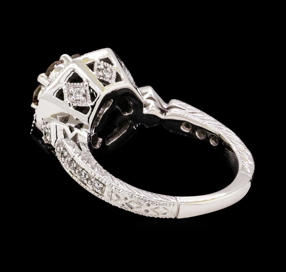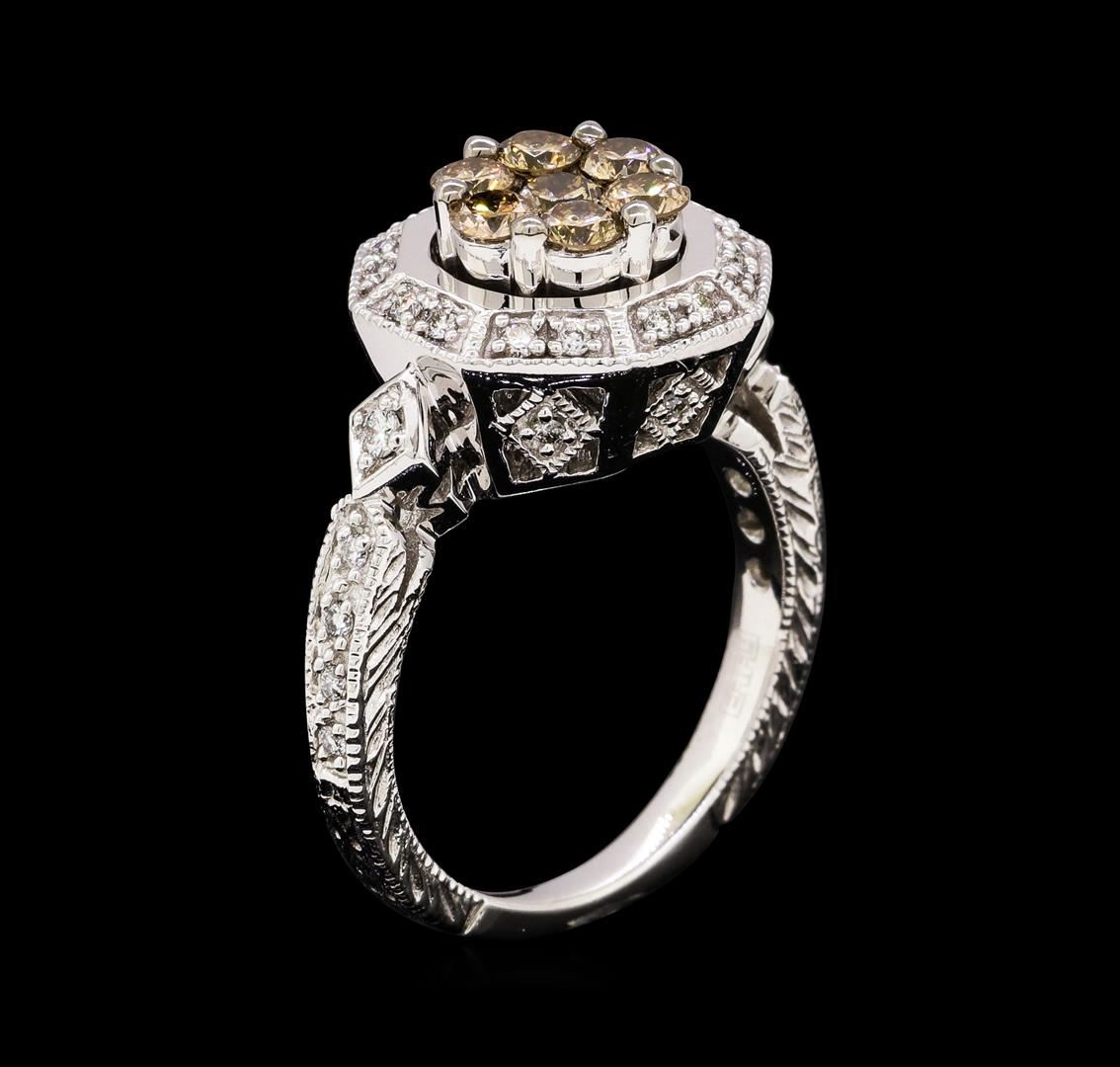 One electronically tested 14KT white gold lady's cast fashion ring with a cathedral shank with a bright polish, hand-engraved detail finish. The featured lady's ring has milgrain detailing and a shank measuring 2.12 millimeters wide. Trademark is Effy. Identified with markings of '14K'. Condition is new, good workmanship. Containing: One prong set round brilliant cut diamond, measuring 3.50 - 3.45 x 2.16mm (depth est.) approximate weight of 0.16ct. Colored gemstones are presumed to have been subjected to commonly used enhancement processes. Graded in the setting. Color Fancy Light Brown Clarity SI-2 Cut Good Six prong set round brilliant cut diamonds, measuring 3.00 - 2.95 x 1.85mm (depth est.) approximate total weight of 6 Stones = 0.60ct. Graded in the setting. Color Fancy Light Brown Clarity SI-1 to SI-2 Cut Good Two prong set round brilliant cut diamonds, measuring 1.80 - 1.70 x 1.09mm (depth est.) approximate total weight of 2 Stones = 0.04ct. Graded in the setting. Color H Clarity SI-2 Cut Good Thirty prong set round brilliant cut diamonds, measuring 1.10 - 1.00 x 0.63mm (depth est.) approximate total weight of 30 Stones = 0.12ct. Graded in the setting. Color H - I Clarity SI-1 to SI-2 Cut Good. Total Weight of Diamonds 0.92ct.. Total Weight of Ring 8.40gm GAS Appraised at $3810.00. GAS Appraised at $3,810.00.