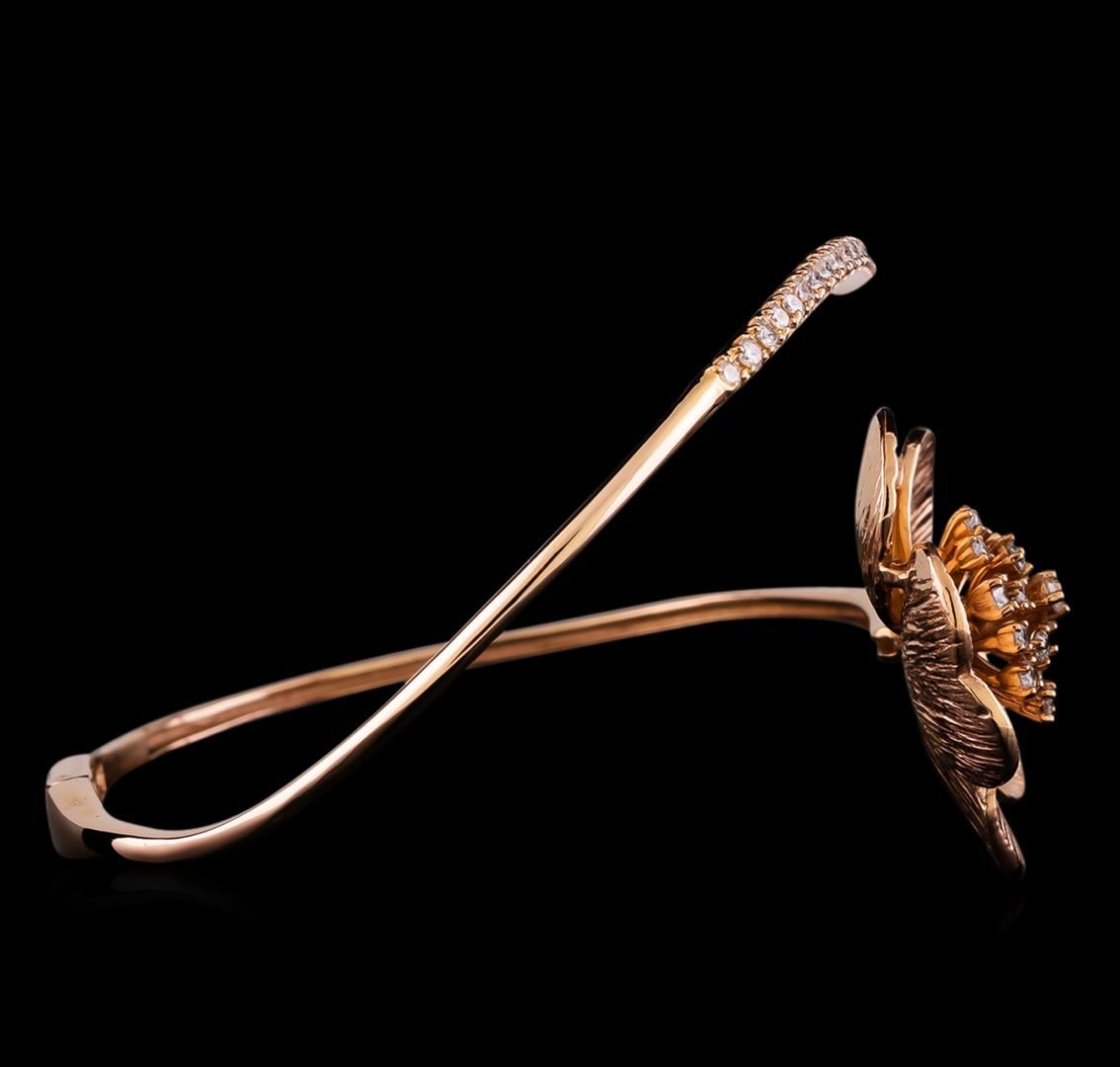 One electronically tested 14KT rose lady's combination cast & assembled fashion cuff bracelet with a bright polish finish. The featured lady's bracelet has a flower motif and measures seven inches in length. Identified with markings of 'K14'. Condition is new, good workmanship. Containing: Twenty-Five prong set round brilliant cut diamonds, measuring 1.95 - 1.85 x 1.16mm (depth est.) approximate total weight of 25 Stones = 0.64ct. Graded in the setting. Clarity SI-1 to SI-2. Color: H - I Cut Good Four prong set round brilliant cut diamonds, measuring 2.30 - 2.20 x 1.40mm (depth est.) approximate total weight of 4 Stones = 0.18ct. Graded in the setting. Clarity SI-1 to SI-2. Color: H - I Cut Good Five prong set round brilliant cut diamonds, measuring 1.80 - 1.70 x 1.05mm (depth est.) approximate total weight of 5 Stones = 0.10ct. Graded in the setting. Clarity SI-1 to SI-2. Color: H - I Cut Good. Total Weight of Diamonds 0.92ct.. Total Weight of Bracelet 17.50gm. GAS Appraised at $5,190.00.