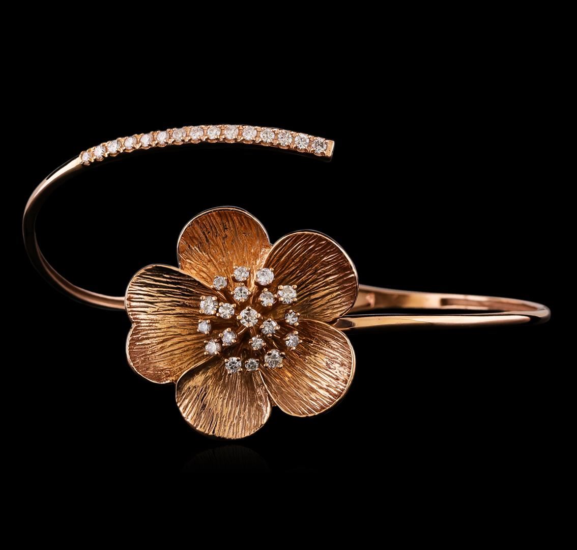 One electronically tested 14KT rose lady's combination cast & assembled fashion cuff bracelet with a bright polish finish. The featured lady's bracelet has a flower motif and measures seven inches in length. Identified with markings of 'K14'. Condition is new, good workmanship. Containing: Twenty-Five prong set round brilliant cut diamonds, measuring 1.95 - 1.85 x 1.16mm (depth est.) approximate total weight of 25 Stones = 0.64ct. Graded in the setting. Clarity SI-1 to SI-2. Color: H - I Cut Good Four prong set round brilliant cut diamonds, measuring 2.30 - 2.20 x 1.40mm (depth est.) approximate total weight of 4 Stones = 0.18ct. Graded in the setting. Clarity SI-1 to SI-2. Color: H - I Cut Good Five prong set round brilliant cut diamonds, measuring 1.80 - 1.70 x 1.05mm (depth est.) approximate total weight of 5 Stones = 0.10ct. Graded in the setting. Clarity SI-1 to SI-2. Color: H - I Cut Good. Total Weight of Diamonds 0.92ct.. Total Weight of Bracelet 17.50gm. GAS Appraised at $5,190.00.