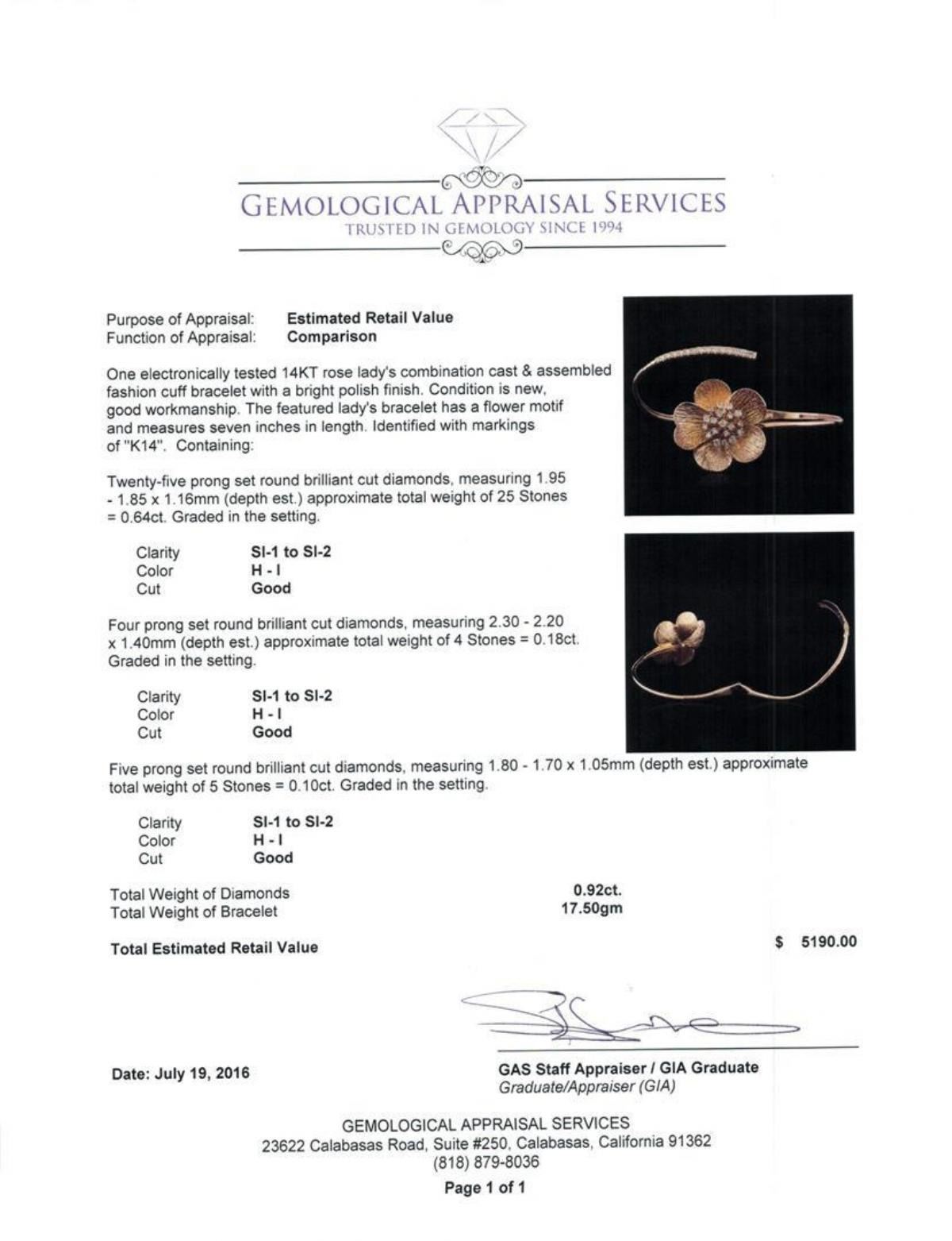 One electronically tested 14KT rose lady's combination cast & assembled fashion cuff bracelet with a bright polish finish. The featured lady's bracelet has a flower motif and measures seven inches in length. Identified with markings of 'K14'. Condition is new, good workmanship. Containing: Twenty-Five prong set round brilliant cut diamonds, measuring 1.95 - 1.85 x 1.16mm (depth est.) approximate total weight of 25 Stones = 0.64ct. Graded in the setting. Clarity SI-1 to SI-2. Color: H - I Cut Good Four prong set round brilliant cut diamonds, measuring 2.30 - 2.20 x 1.40mm (depth est.) approximate total weight of 4 Stones = 0.18ct. Graded in the setting. Clarity SI-1 to SI-2. Color: H - I Cut Good Five prong set round brilliant cut diamonds, measuring 1.80 - 1.70 x 1.05mm (depth est.) approximate total weight of 5 Stones = 0.10ct. Graded in the setting. Clarity SI-1 to SI-2. Color: H - I Cut Good. Total Weight of Diamonds 0.92ct.. Total Weight of Bracelet 17.50gm. GAS Appraised.