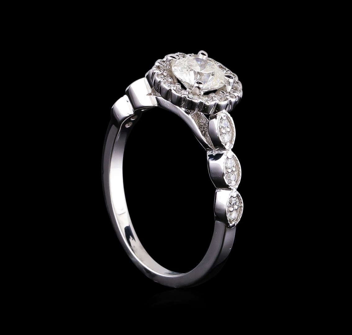 One electronically tested 14KT white gold lady's cast wedding ring with a scalloped shank halo with a bright polish with milgrain detailing finish. The featured lady's ring has a shank measuring 1.83 millimeters in width. Identified with markings of "14K". Condition is new, good workmanship. Containing: One prong set round brilliant cut diamond, measuring 5.68 - 5.65 x 3.52mm (depth est.) , 5.00.%. GTCF approximate weight of 0.72ct. Graded in the setting. Clarity: SI-2. Color: Very Good Twenty-Eight prong set round brilliant cut diamonds, measuring 1.30 - 1.20 x 0.78mm (depth est.) approximate total weight of 28 Stones = 0.20ct. Graded in the setting. Clarity: VS-2 to SI-2. Color: H - I. Cut Good. Total Weight of Diamonds 0.92ct. Total Weight of Ring 3.40gm GAS Appraised at $6,985.00.