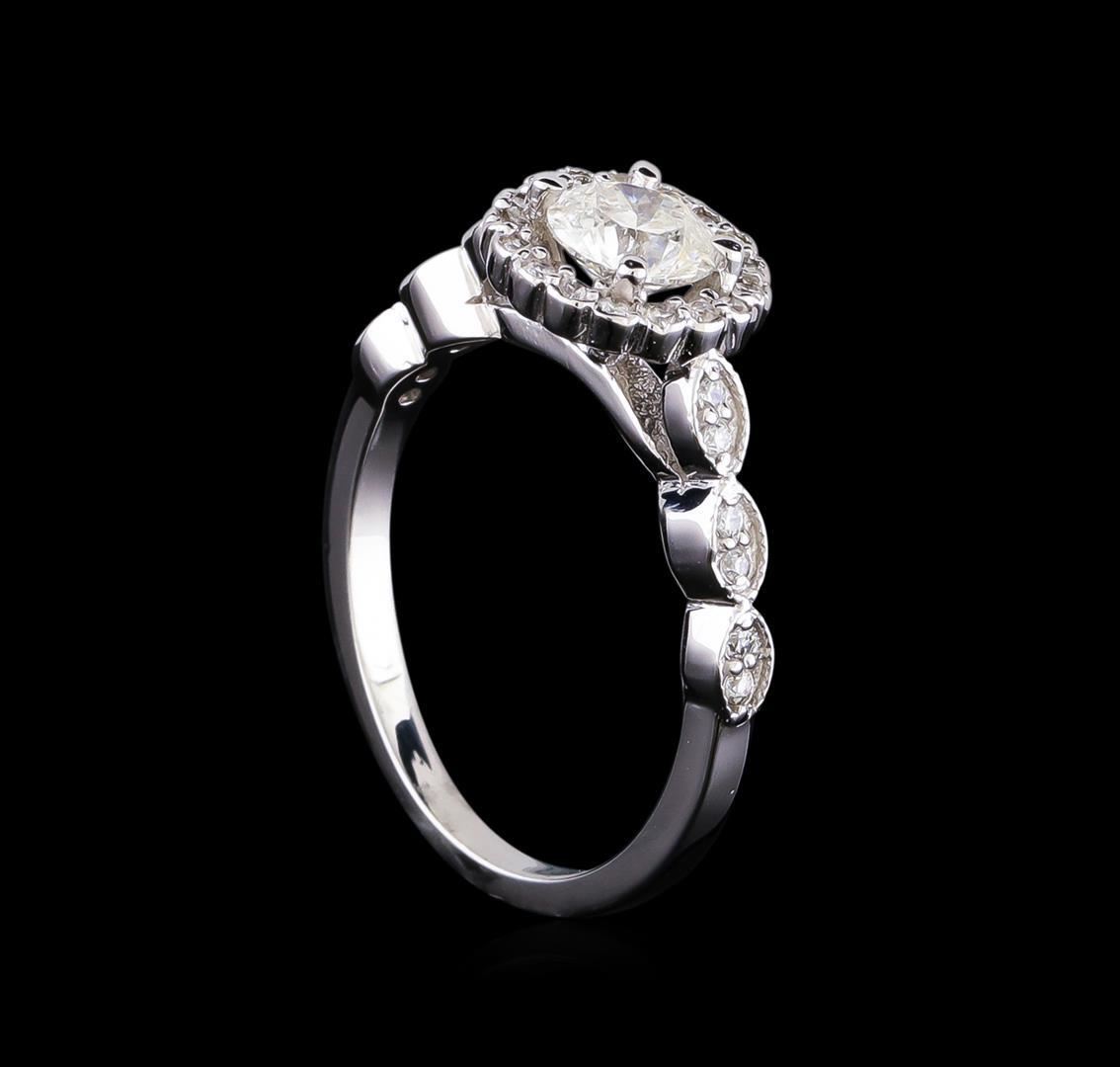 One electronically tested 14KT white gold lady's cast wedding ring with a scalloped shank halo with a bright polish with milgrain detailing finish. The featured lady's ring has a shank measuring 1.83 millimeters in width. Identified with markings of "14K". Condition is new, good workmanship. Containing: One prong set round brilliant cut diamond, measuring 5.68 - 5.65 x 3.52mm (depth est.) , 5.00.%. GTCF approximate weight of 0.72ct. Graded in the setting. Clarity: SI-2. Color: Very Good Twenty-Eight prong set round brilliant cut diamonds, measuring 1.30 - 1.20 x 0.78mm (depth est.) approximate total weight of 28 Stones = 0.20 ct. Graded in the setting. Clarity: VS-2 to SI-2. Color: H - I. Cut Good. Total Weight of Diamonds 0.92ct. Total Weight of Ring 3.40gm GAS Appraised.