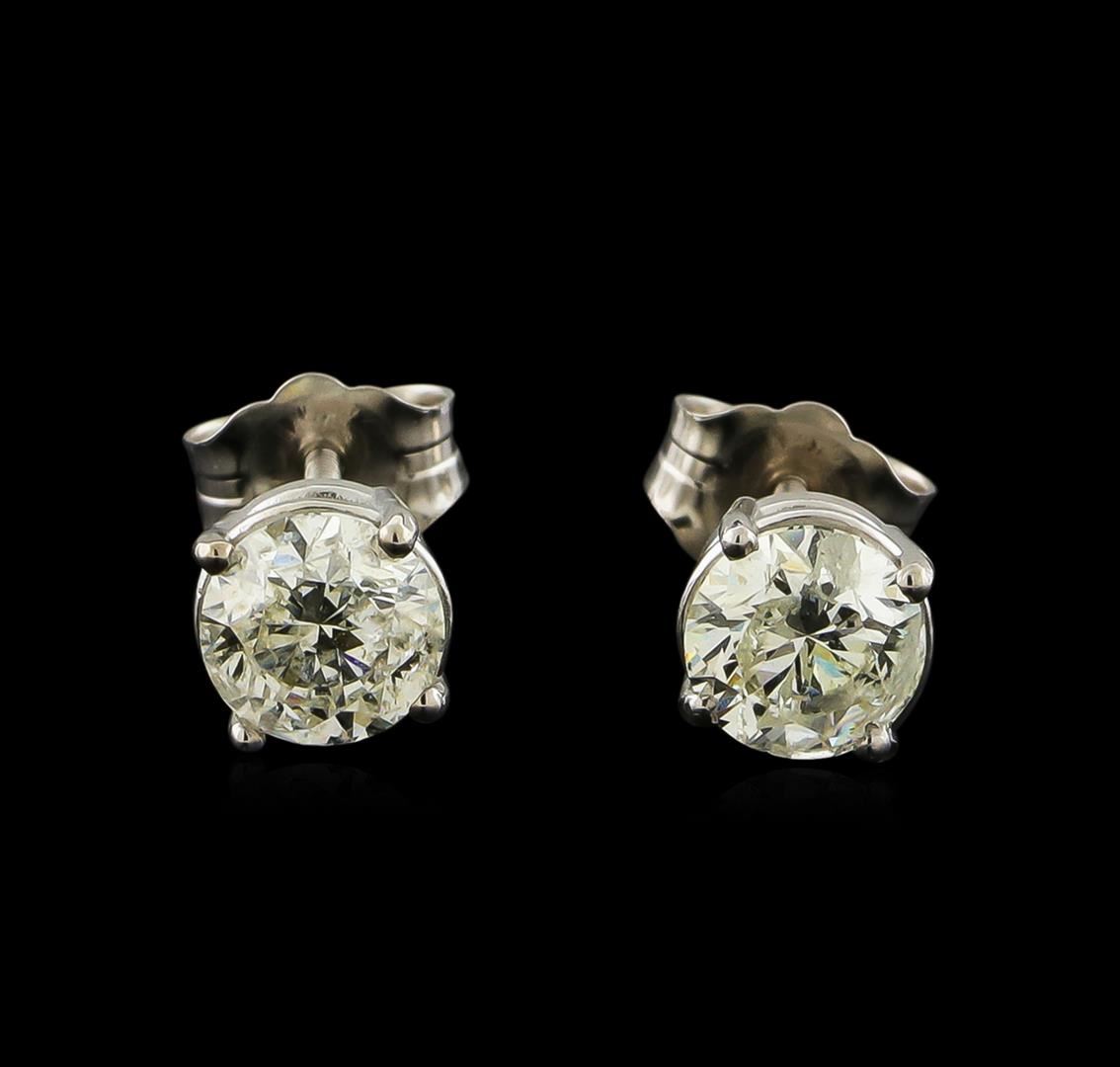 One pair electronically tested 14KT white gold cast & assembled diamond solitaire earrings with screw backs. Bright polish finish. Condition is new, good workmanship. Containing: One prong set round brilliant cut diamond, measuring 5.00 - 5.00 x 3.20mm (depth est.) approximate weight of 0.46ct with a faint blue fluorescence. Graded in the setting. Clarity: I-2. Color: 64.0%. Table 60.0%. One prong set round brilliant cut diamond, measuring 4.90 - 4.90 x 3.30mm (depth est.) approximate weight of 0.46ct with a strong blue fluorescence. Graded in the setting. Clarity: I-2. Color: 67.4%. Table 61.2%. Total Weight of Diamonds 0.92ct. Total Weight of Earrings 0.90gm. AIG Appraised at $2,180.00.