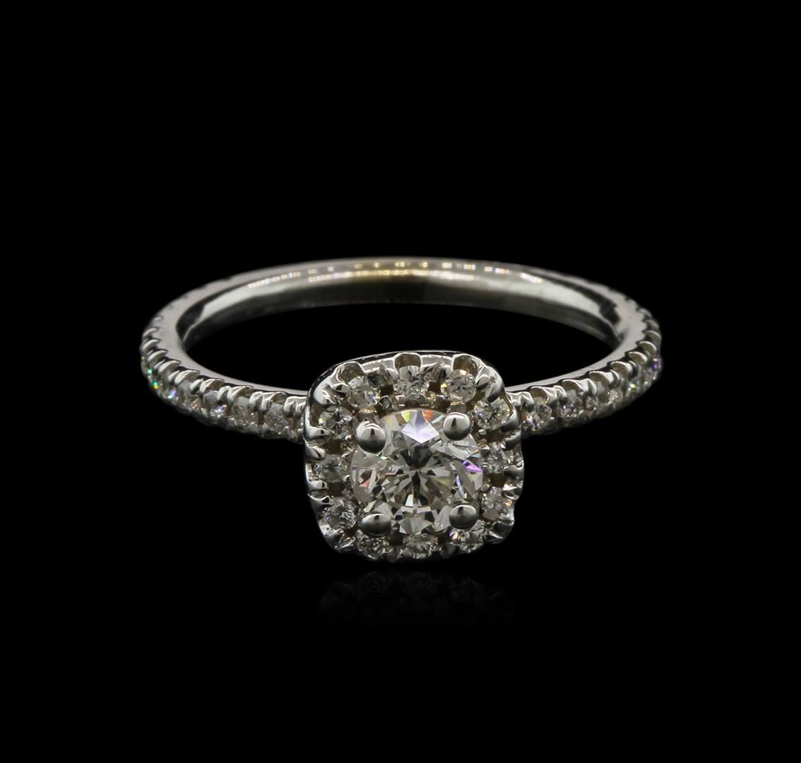 One electronically tested 14KT white gold lady's combination cast & assembled engagement ring with a bright polish finish. The featured ring has a 1.95 millimeter wide shank. Condition is new, good workmanship. Containing: One prong set round brilliant cut diamond, measuring 4.94 - 4.92 x 3.20mm (depth est.) , 5.00.%. GTCF approximate weight of 0.50ct. Naturally occurring internal & external characteristics are present. Graded in the setting. Clarity: I-1. Color: Very Good Forty-Two split prong set round brilliant cut diamonds, measuring 1.40 - 1.35 x 0.87mm (depth est.) approximate. Total Weight of 42 Stones = 0.42ct. Graded in the setting. Clarity: SI-1 to I-1. Color: G - I. Cut Good. Total Weight of Diamonds 0.92ct. Total Weight of Ring 3.00gm. GAS Appraised at $4,765.00.