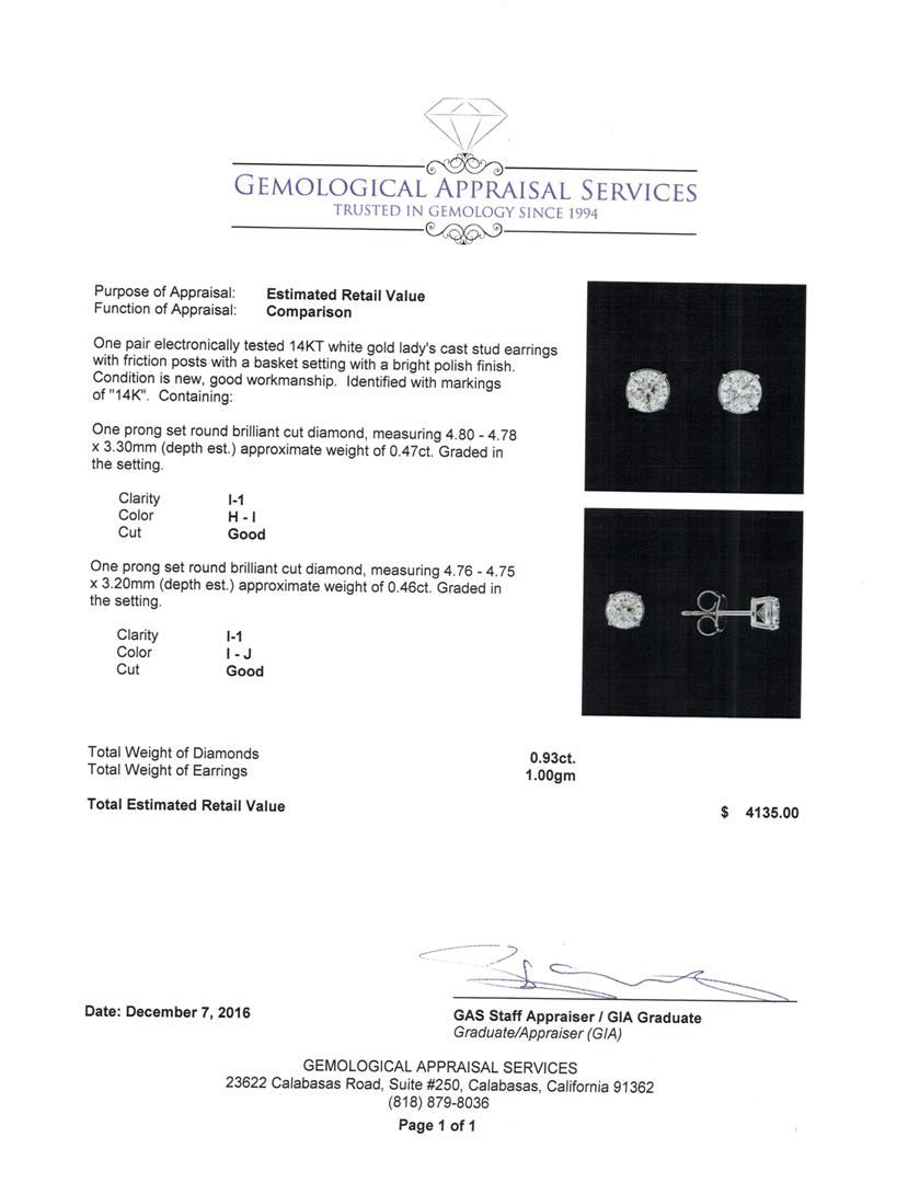 One pair electronically tested 14KT white gold lady's cast stud earrings with friction posts with a basket setting with a bright polish finish. Identified with markings of '14K'. Condition is new, good workmanship. Containing: One prong set round brilliant cut diamond, measuring 4.80 - 4.78 x 3.30mm (depth est.) approximate weight of 0.47ct. Graded in the setting. Clarity I-1. Color: H - I Cut Good One prong set round brilliant cut diamond, measuring 4.76 - 4.75 x 3.20mm (depth est.) approximate weight of 0.46ct. Graded in the setting. Clarity I-1. Color: I - J Cut Good. Total Weight of Diamonds 0.93ct.. Total Weight of Earrings 1.00gm. GAS Appraised at $4,135.00.