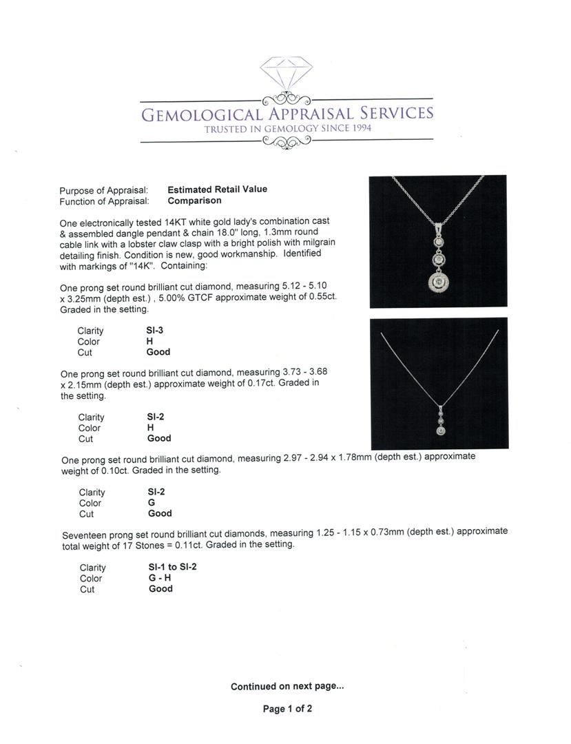 One electronically tested 14KT white gold lady's combination cast & assembled dangle pendant & chain 18.0' long, 1.3mm round cable link with a lobster claw clasp with a bright polish with milgrain detailing finish. Identified with markings of '14K'. Condition is new, good workmanship. Containing: One prong set round brilliant cut diamond, measuring 5.12 - 5.10 x 3.25mm (depth est.) , 5.00.%. GTCF approximate weight of 0.55ct. Graded in the setting. Clarity SI-3. Color: H Cut Good One prong set round brilliant cut diamond, measuring 3.73 - 3.68 x 2.15mm (depth est.) approximate weight of 0.17ct. Graded in the setting. Clarity SI-2. Color: H Cut Good One prong set round brilliant cut diamond, measuring 2.97 - 2.94 x 1.78mm (depth est.) approximate weight of 0.10ct. Graded in the setting. Clarity SI-2. Color: G Cut Good Seventeen prong set round brilliant cut diamonds, measuring 1.25 - 1.15 x 0.73mm (depth est.) approximate total weight of 17 Stones = 0.11ct. Graded in the setting. Clarity SI-1 to SI-2. Color: G - H Cut Good. Total Weight of Diamonds 0.93ct.. Total Weight of Pendant & Chain 3.70gm. GAS Appraised at $5,365.00.